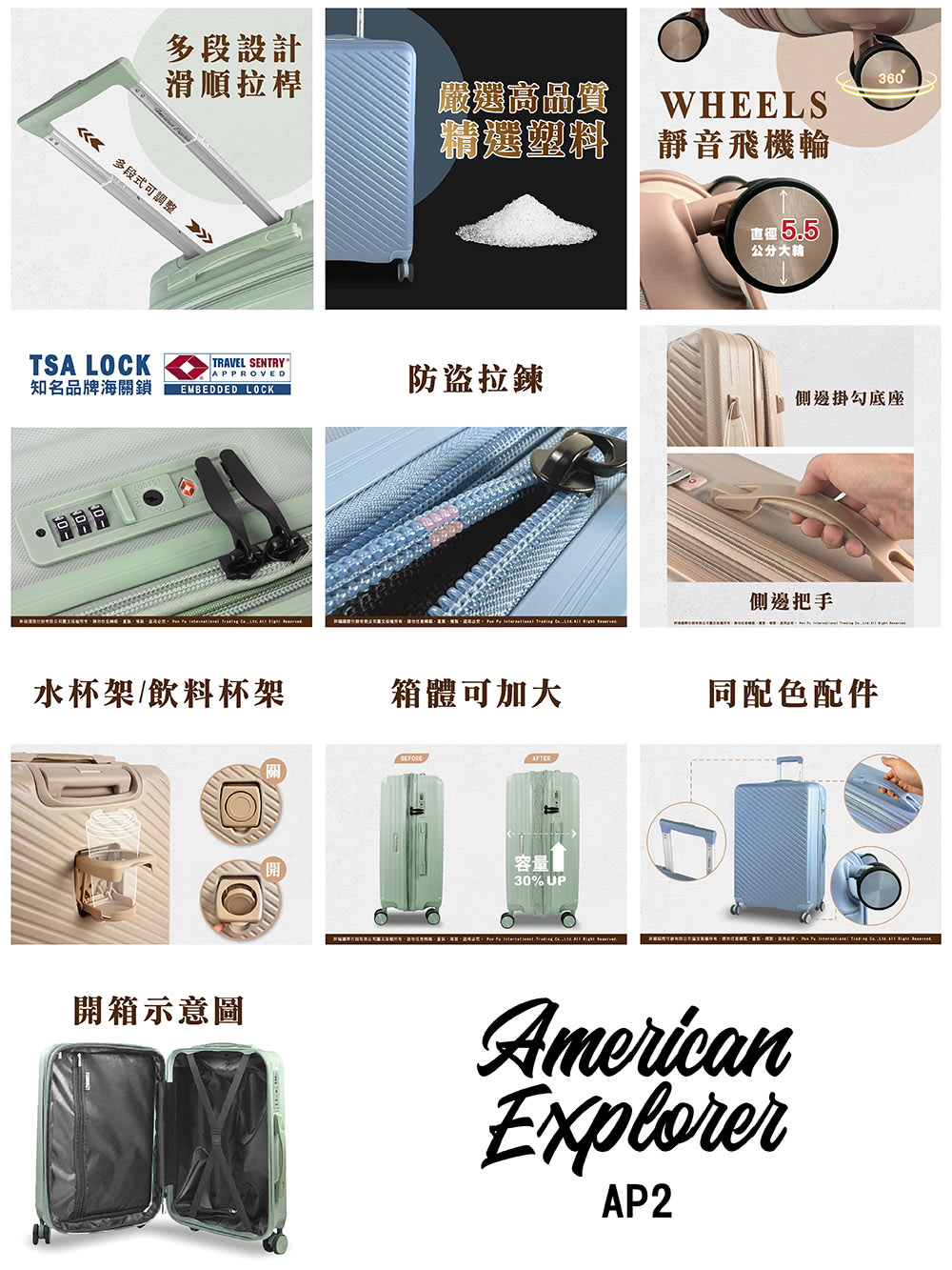 AP2 鎖頭 : 設有內嵌式TSA國際海關密碼鎖,前往歐美國家旅遊,過安檢輕鬆又快速