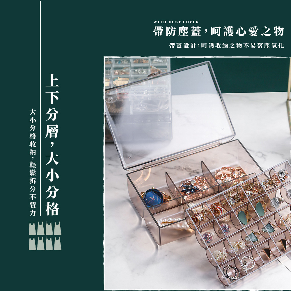 【飾品防塵】大容量便攜式耳環首飾收納盒(手鏈 戒指 項鏈 首飾盒 飾品盒 珠寶盒 透明盒 零件盒 雙層分格)