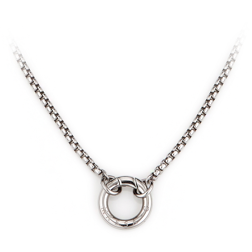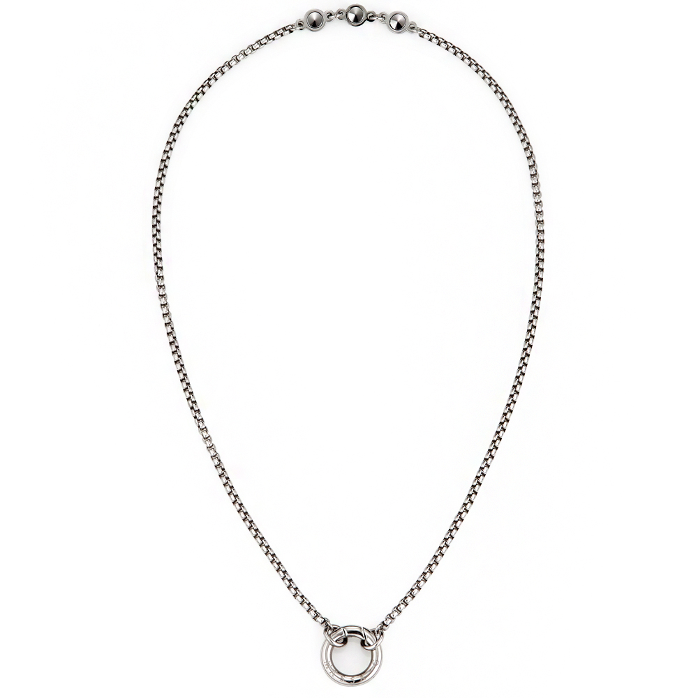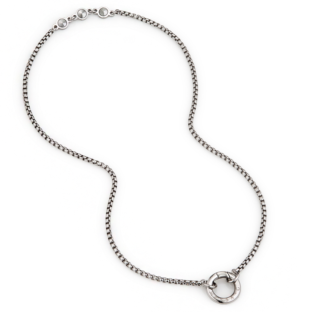 這款項鍊搭配方形的3顆金屬鍺錠,象徵著穩定與力量,白鋼材質賦予其堅固耐用的特性。