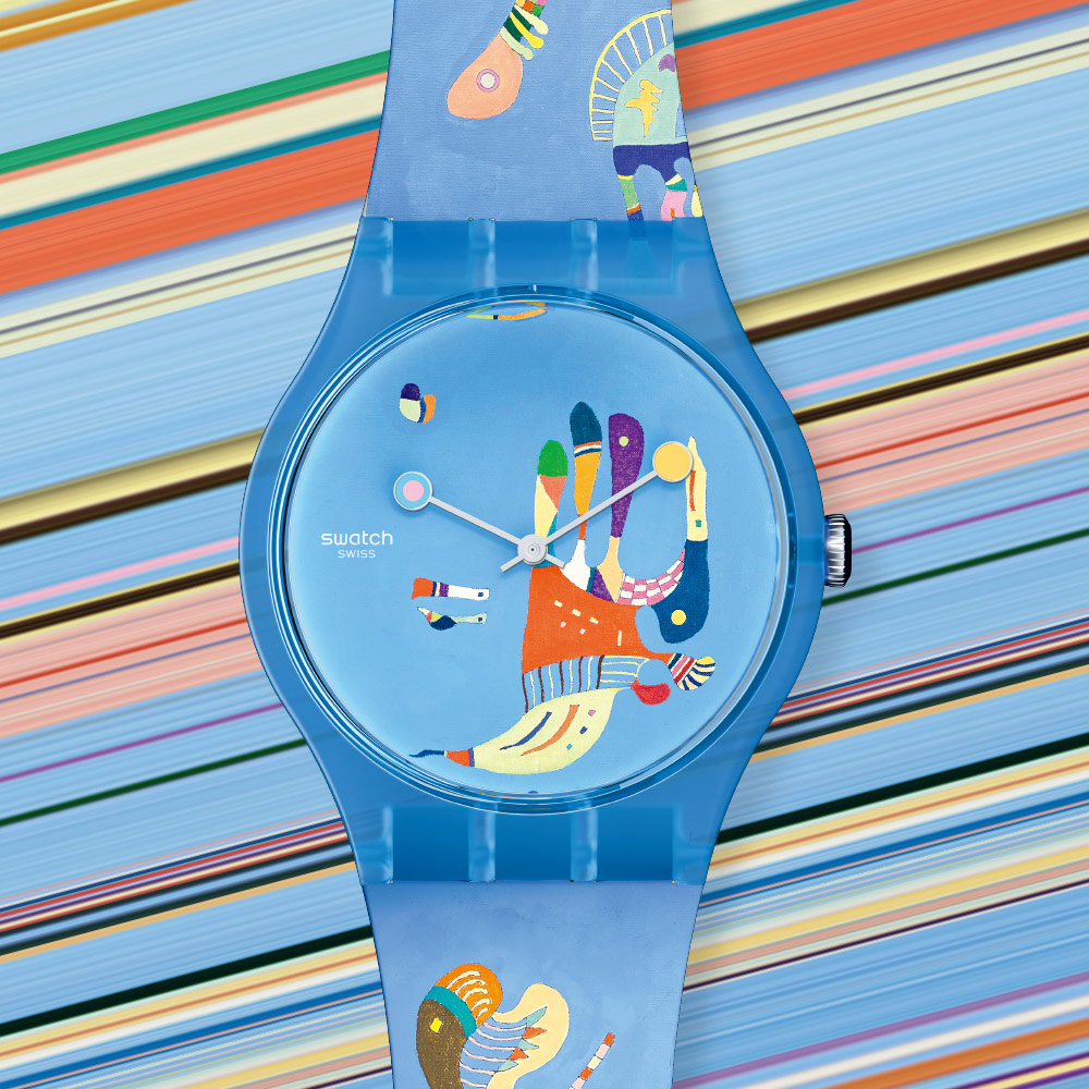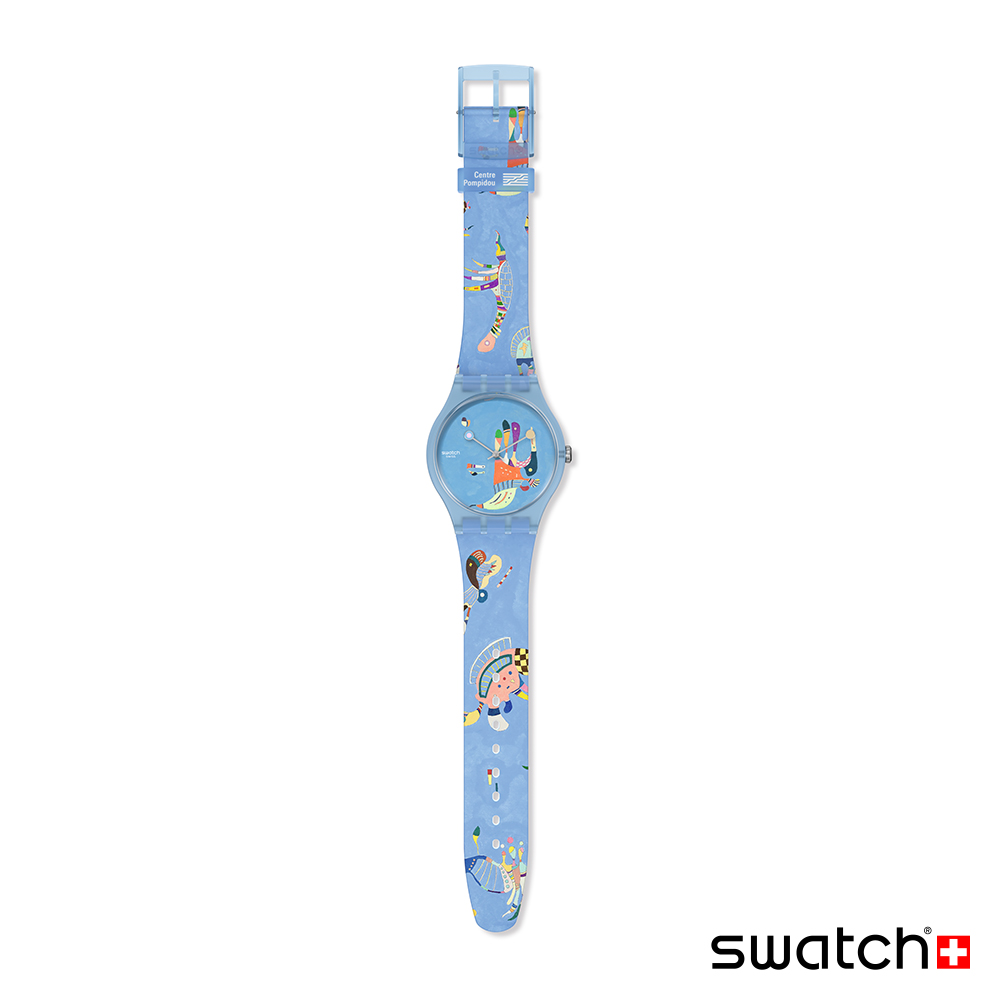 這款Swatch藝術合作系列New Gent腕錶用半透明啞光淺藍色矽膠錶帶展現了Vassily Kandinsky 瓦西里·康丁斯基的作品,錶帶上遍佈了以其畫作《Bleu de Ciel》為基礎的彩色印花。