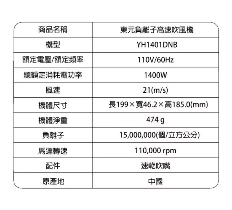 【TECO 東元】負離子高速吹風機 /台 YH1401DNB