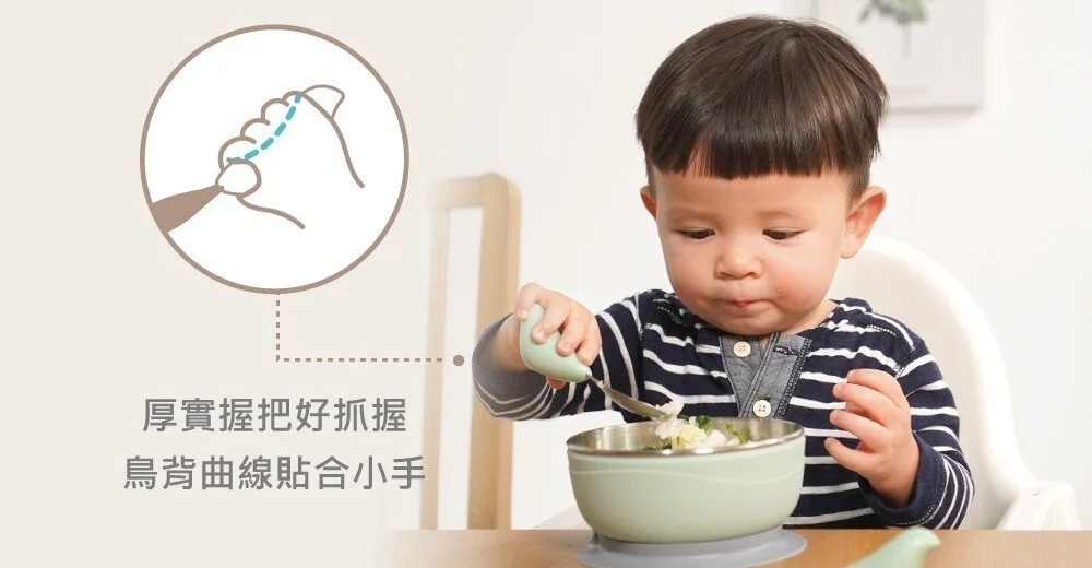 當孩童至1歲~1歲半開始初學用餐,這時控制餐具能力還不穩定,無法流暢調整前臂和手腕動作,通常這階段的孩童會用最直覺「握拳式」握法來掌握餐具。