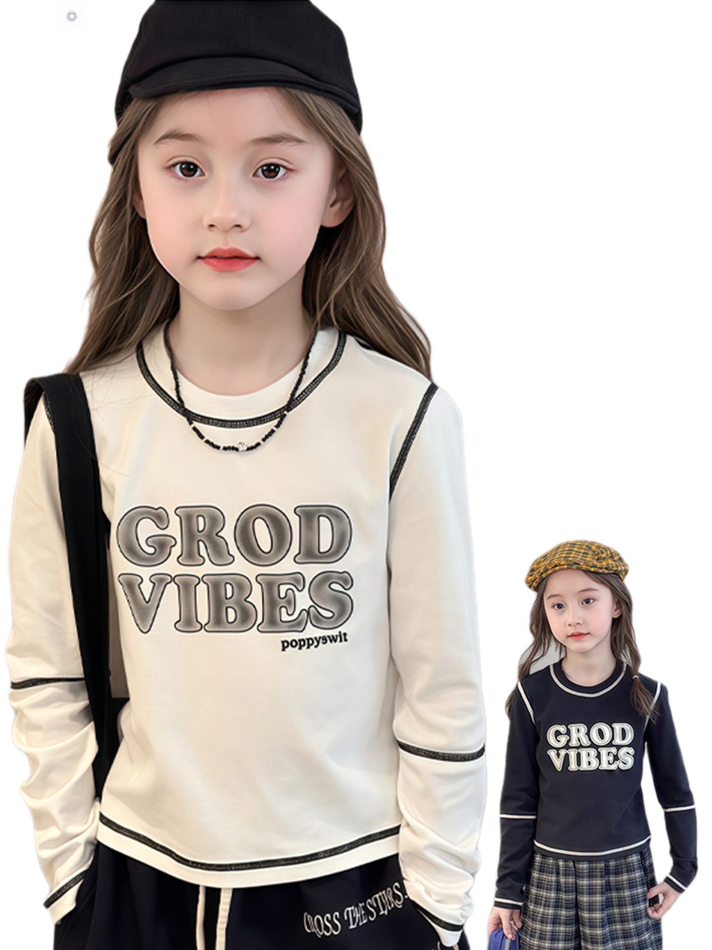 【Arbea】兒童秋季款長袖T卹女孩撞色圓領上衣休閒打底衫內搭童裝【C1249】