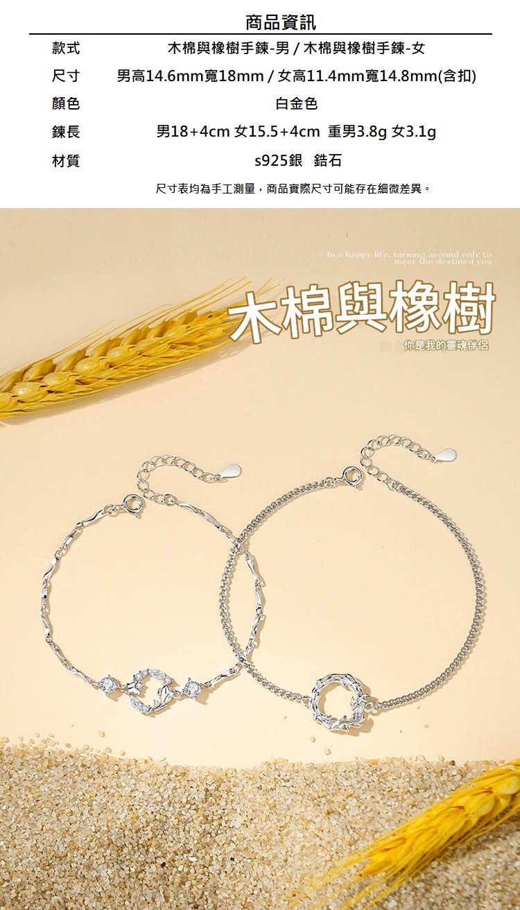 現貨+預購 頂級925純銀手鍊情侶手鏈女首飾情人節禮物-木棉與橡樹情侶手鍊男女飾品a1li26