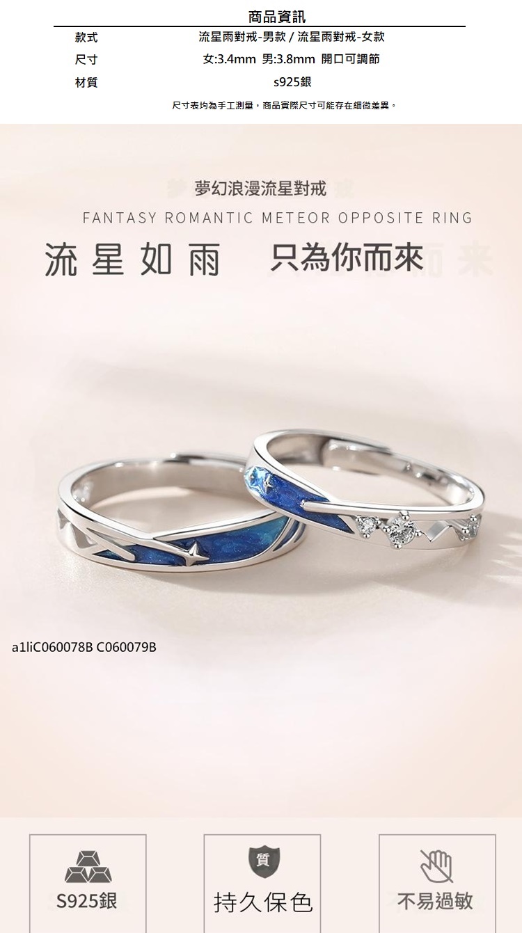 現貨+預購 頂級925純銀戒指婚戒女鑽戒開口戒情侶對戒尾戒情人節禮物-韓版星雨男女飾品a1li59