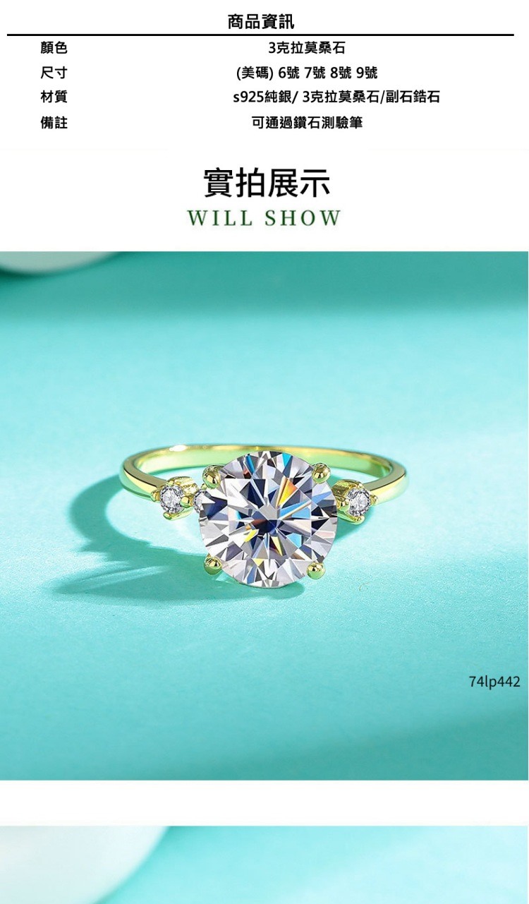 現貨+預購 頂級莫桑鑽石戒指925純銀戒指婚戒女鑽戒子求婚戒情人節禮物-高級3克拉D色戒74lp36