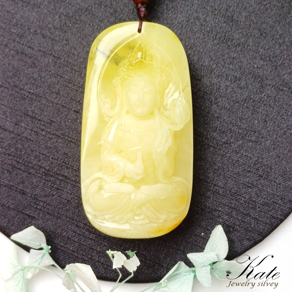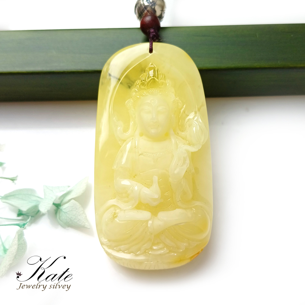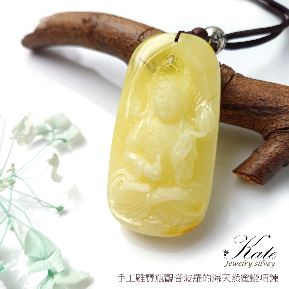 完全是用整塊原礦天然蜜蠟,手工雕刻出一尊寶瓶觀音佛像