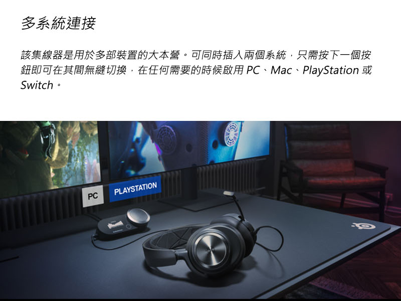 多系統連接 - Arctis Nova Pro 無線耳機簡化您的娛樂活動,實現雙 USB 有線系統的快速切換。