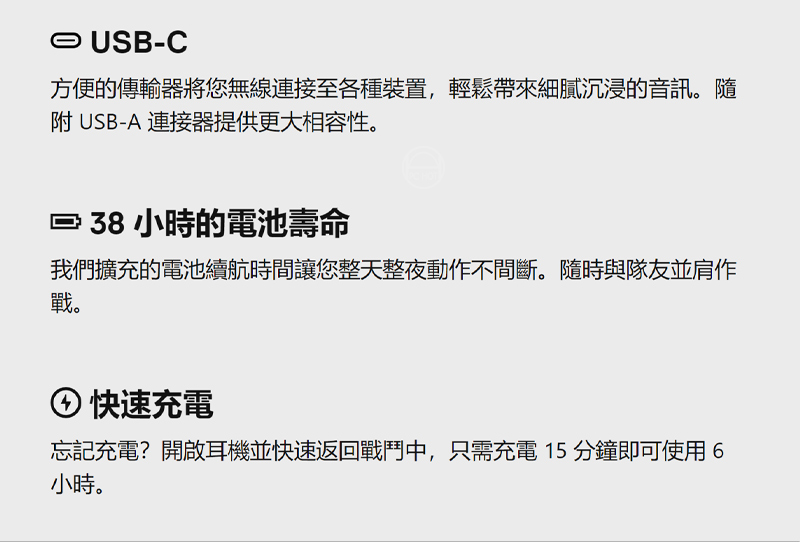 3.USB-C 快速充電,38 小時電池壽命,充電 15 分鐘可使用 6 小時