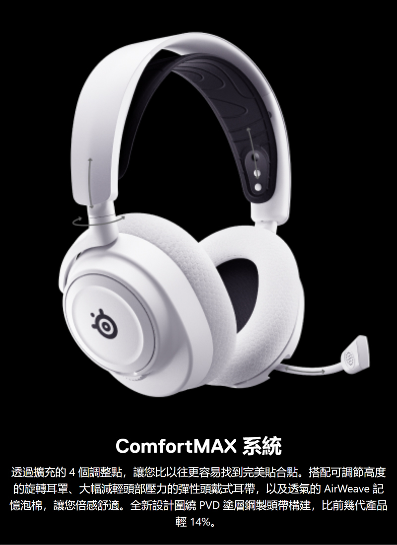 ComfortMAX 系統 - Arctis Nova 7X 無線耳機非常適合長時間使用,具有擴充的配件選項和 4 個調整點。使用全新高度可調的旋轉耳罩、彈性頭戴式耳帶和透氣的 AirWeave 記憶泡沫耳墊,輕鬆找到完美貼合感。全新設計圍繞 PVD 塗層鋼製頭帶構建,比前幾代產品輕 14%。