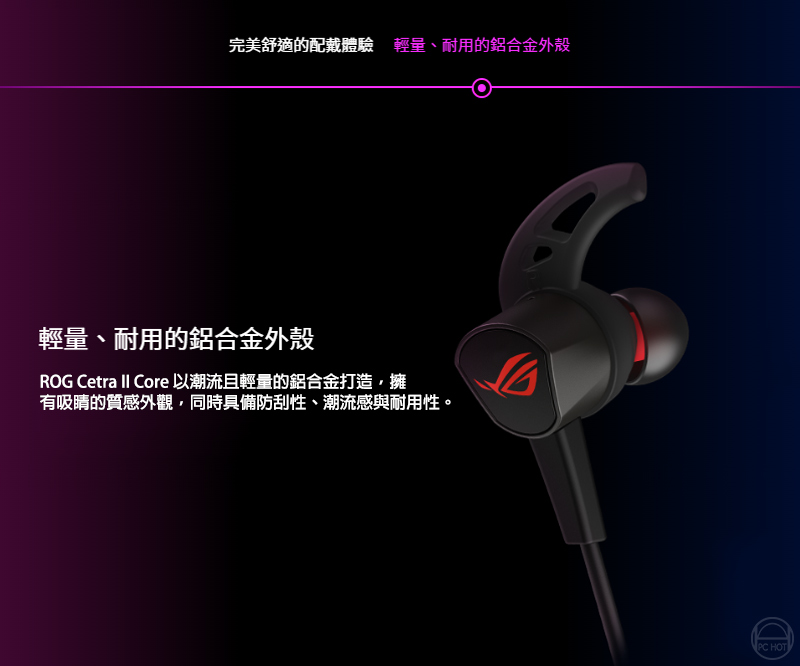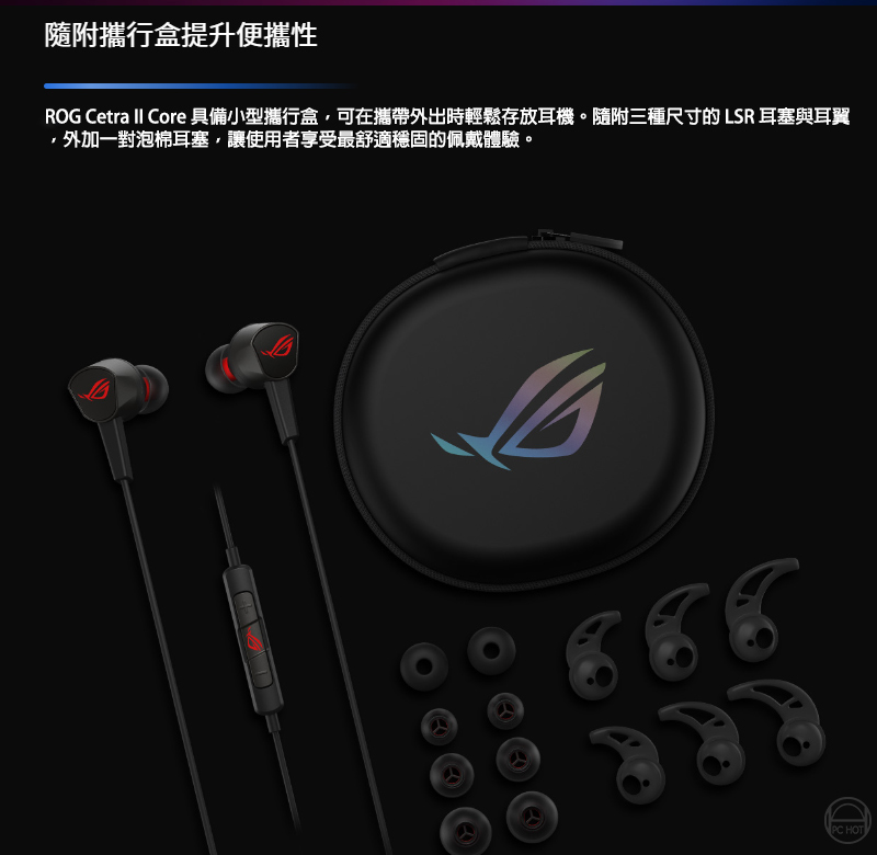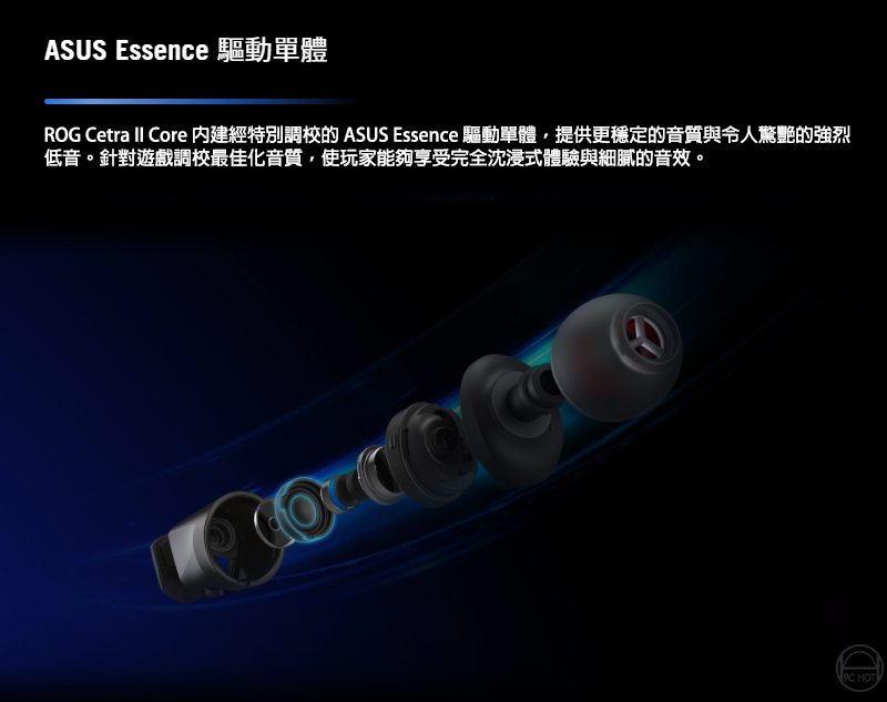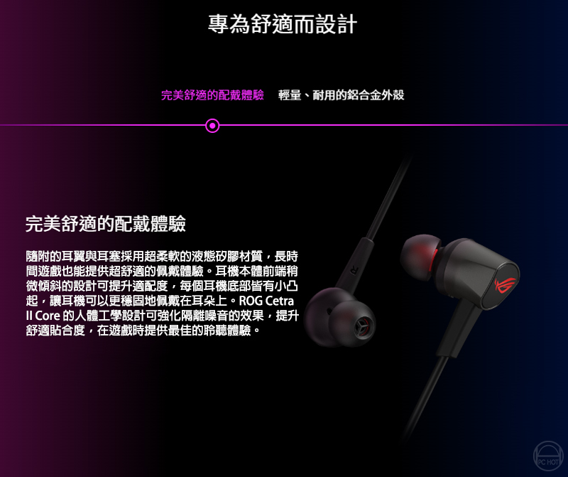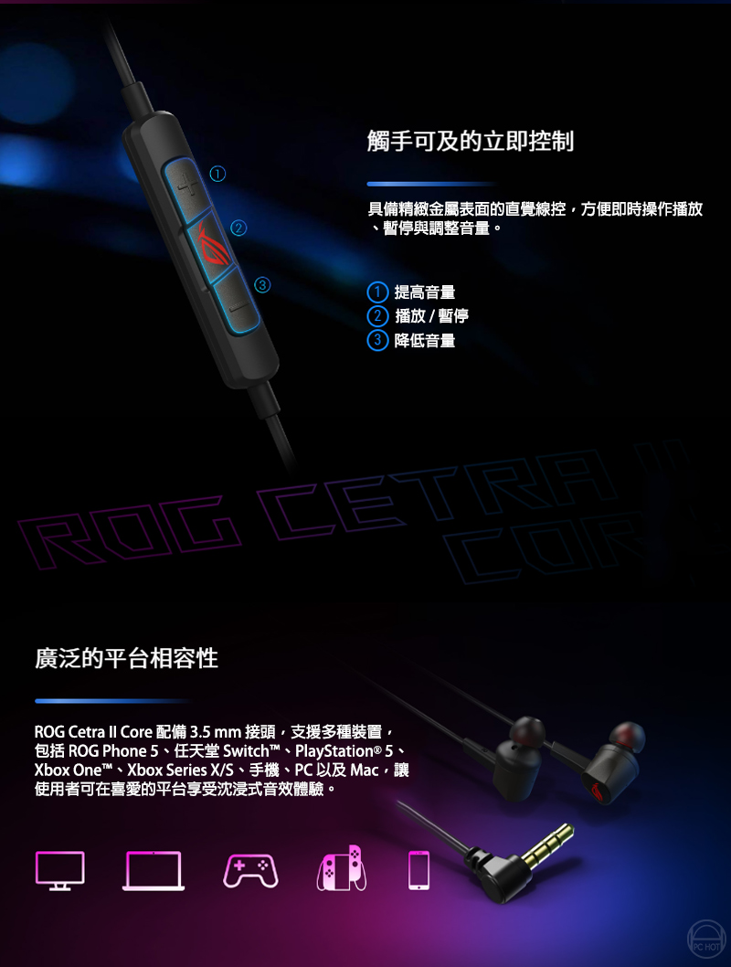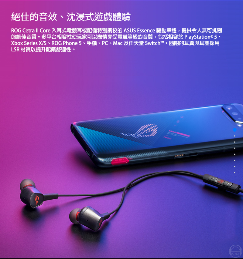 ROG Cetra II Core 入耳式電競耳機搭載液態矽膠 (LSR) 驅動單體以及相容於 PC、筆電、手機、ROG Phone 5、PlayStation 5、Xbox Series X/S 與任天堂 Switch 的 3.5 mm 連接器