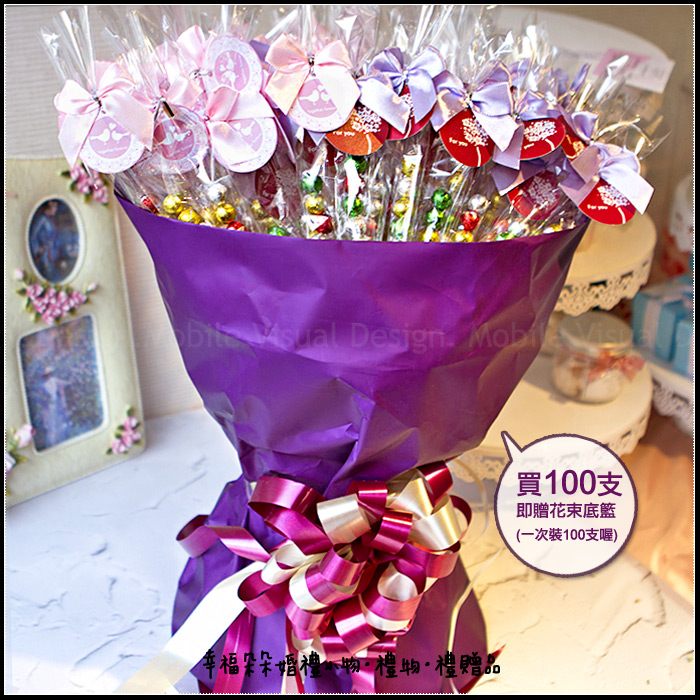 專屬吊牌繽紛巧克力球串X100支+贈花束底籃1個(紫) (新品上市特價中)