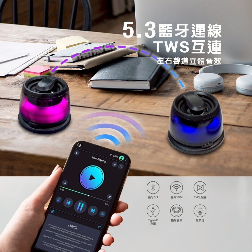 TWS互聯功能:兩顆喇叭可互相配對,享受立體環繞音效。