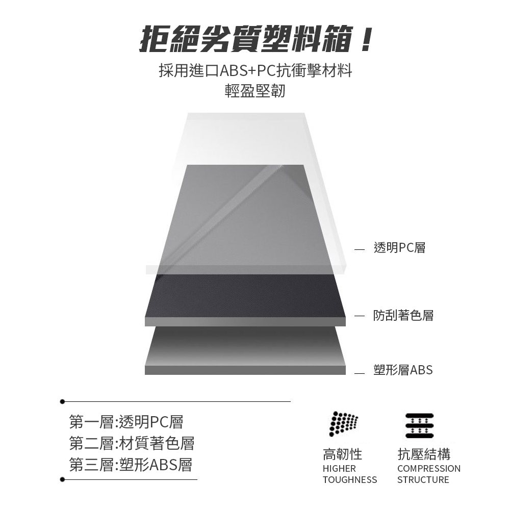 1.ABS+PC材質箱體,輕盈耐用,抗重抗壓。