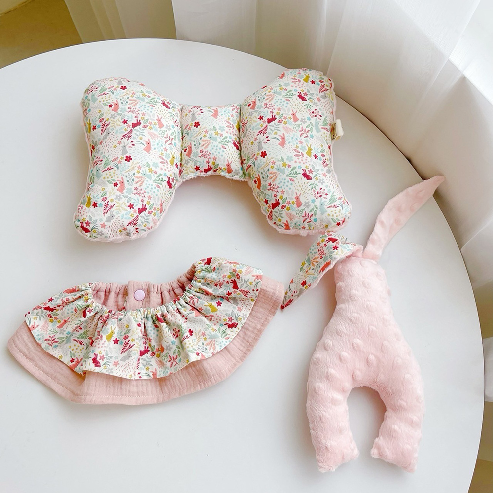 彌月禮盒三件組:天使蝴蝶枕+圍兜+樂豆安撫兔