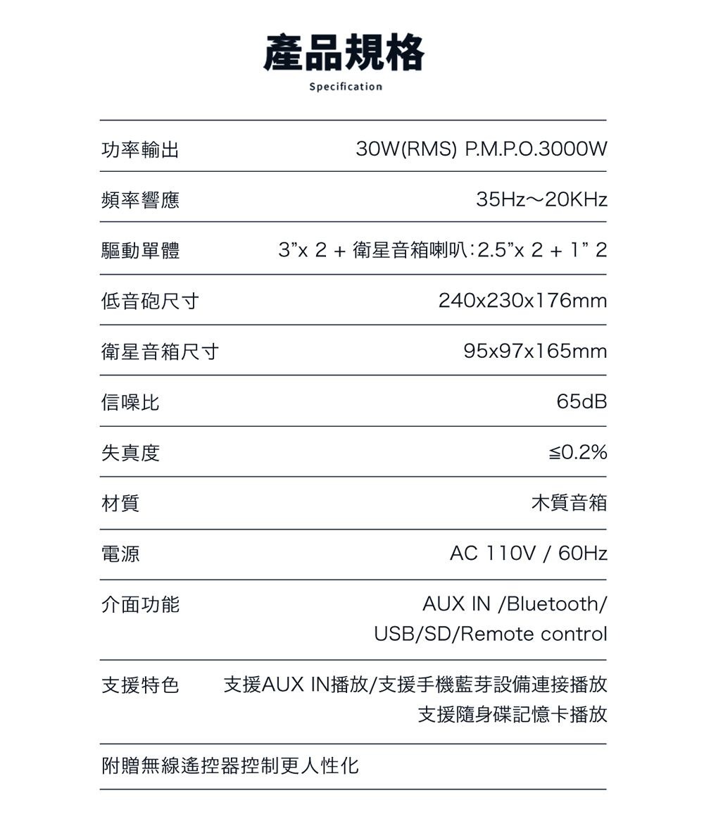 功率輸出:30W(RMS) P.M.P.O.3000W