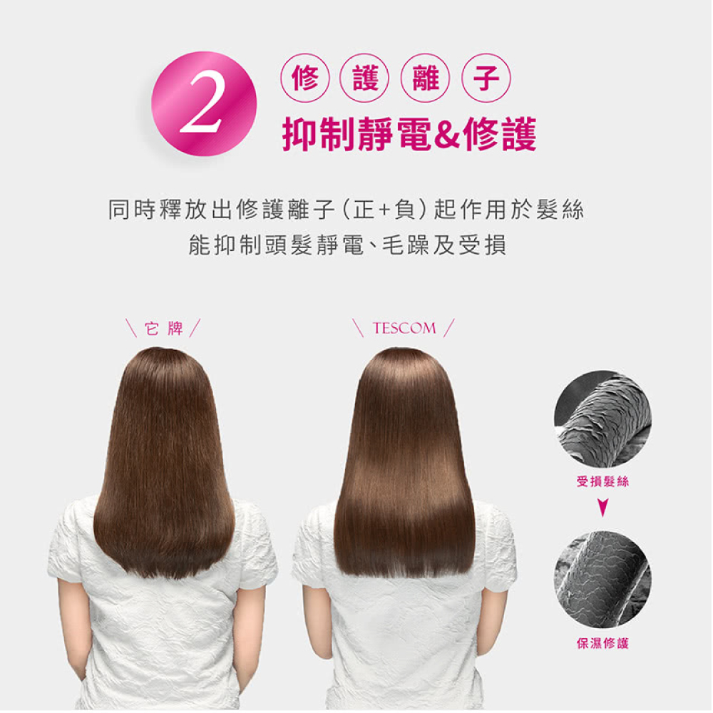 ・速乾! 颱風級風量2.0M³/分 ・抑制靜電有效對抗毛躁髮質 ・修護離子強效保濕修護髮尾 ・雙氣流風罩設計造型輕鬆吹 ・易拔型插頭貼心設計