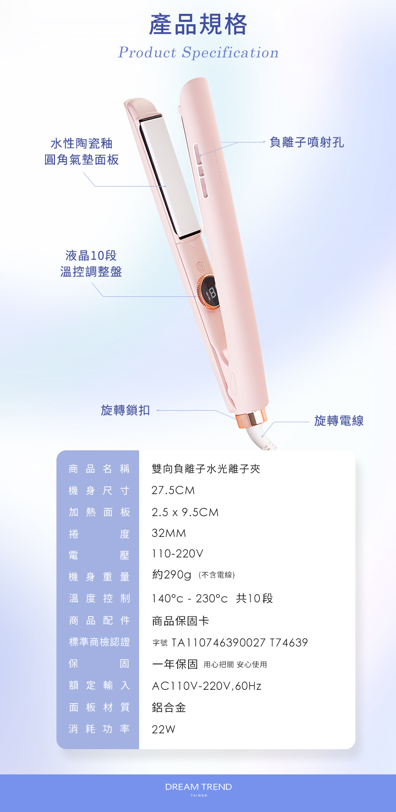 【DREAM TREND 凱夢】DREAM TREND (免運)凱夢雙向負離子水光離子夾 DT-901 (贈收納袋)