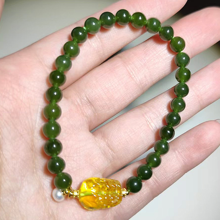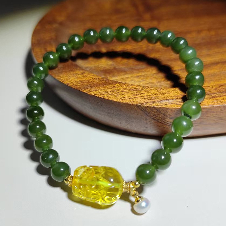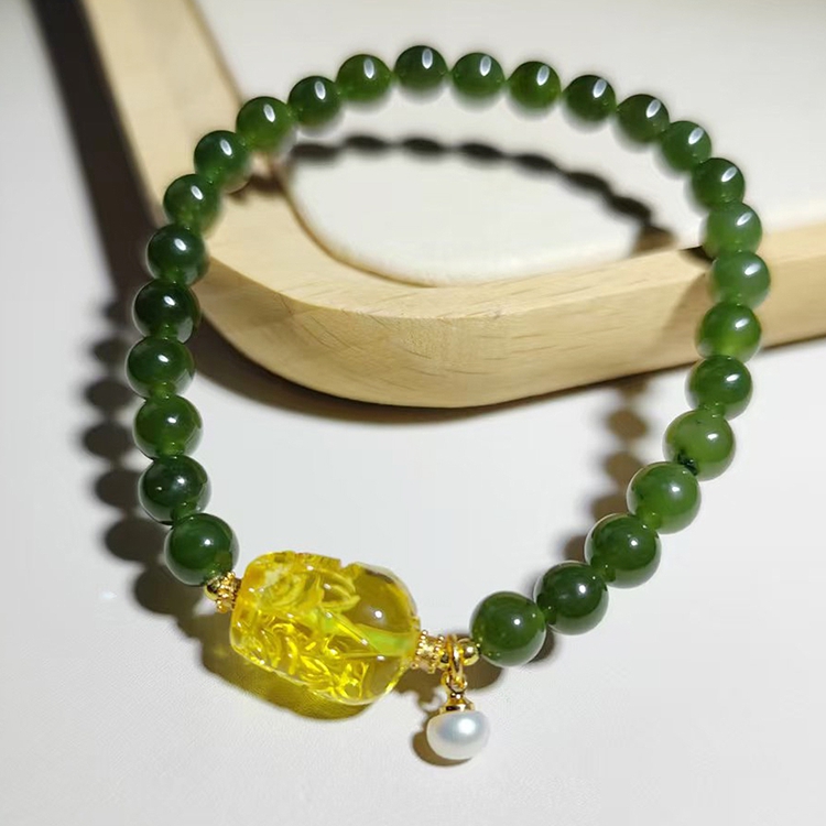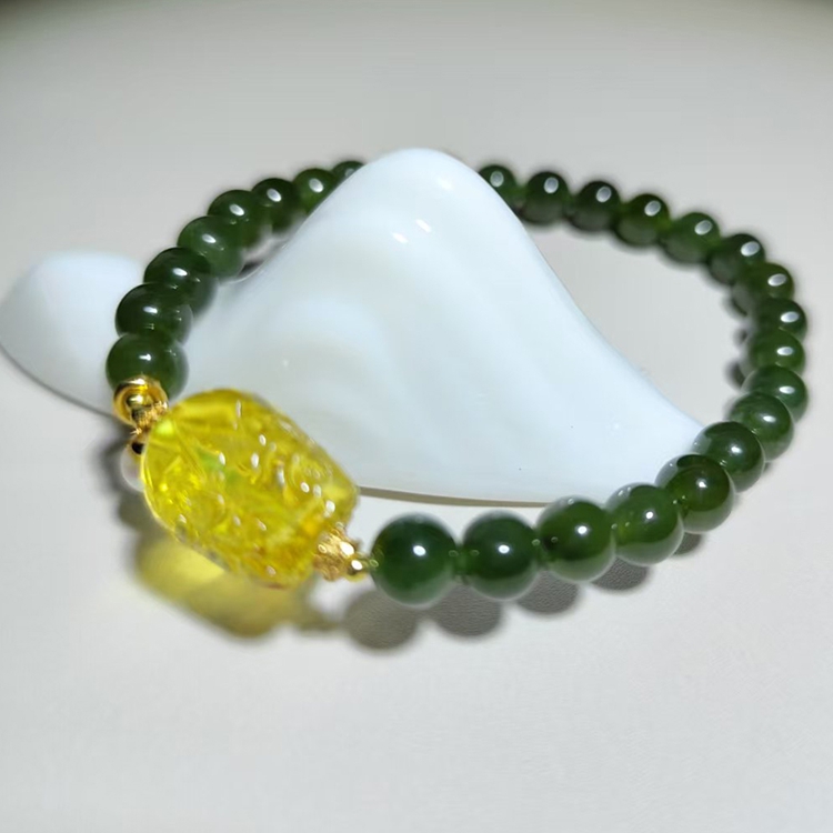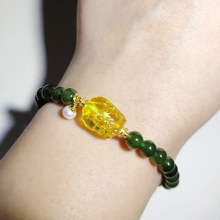 【Paiya 派亞】天然6mm菠菜綠和田玉金珀貔貅單圈手串手鏈少黑點