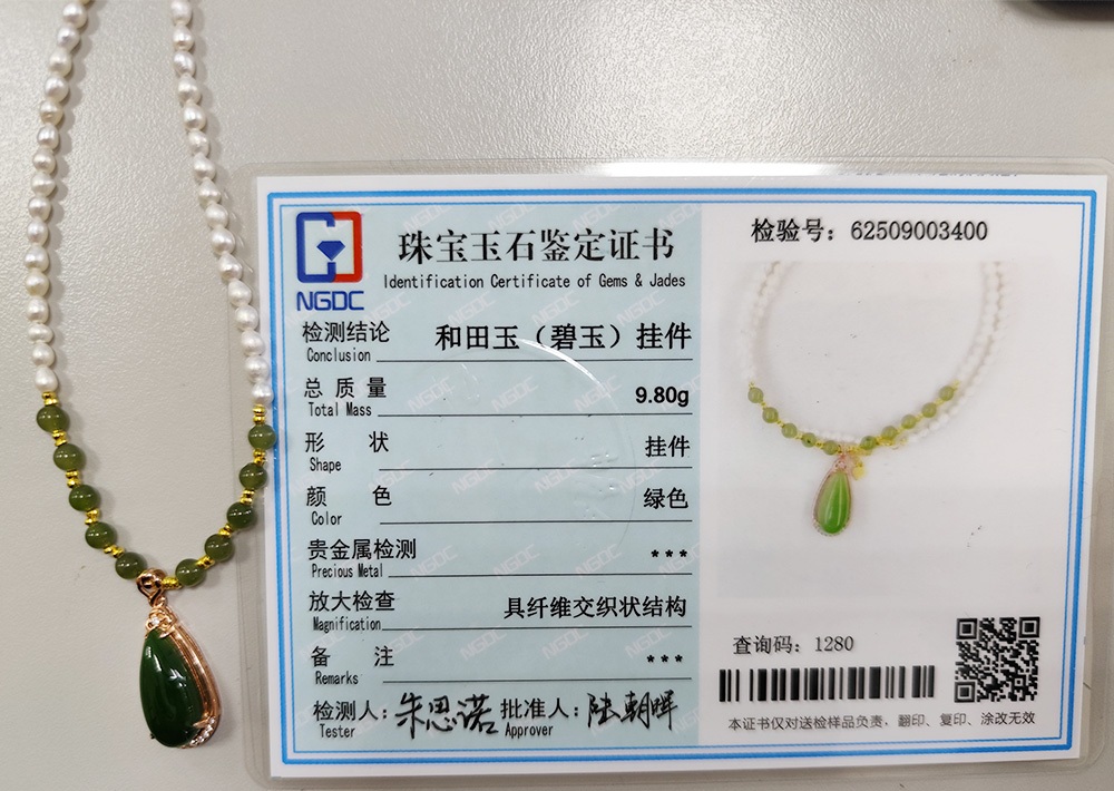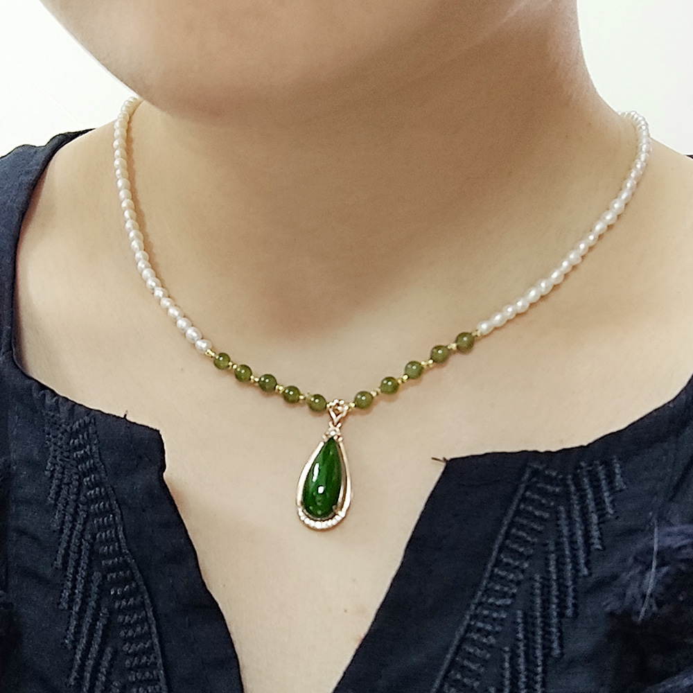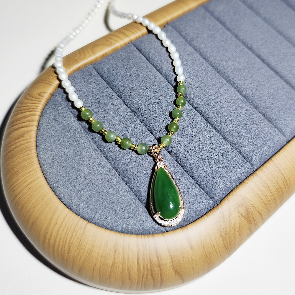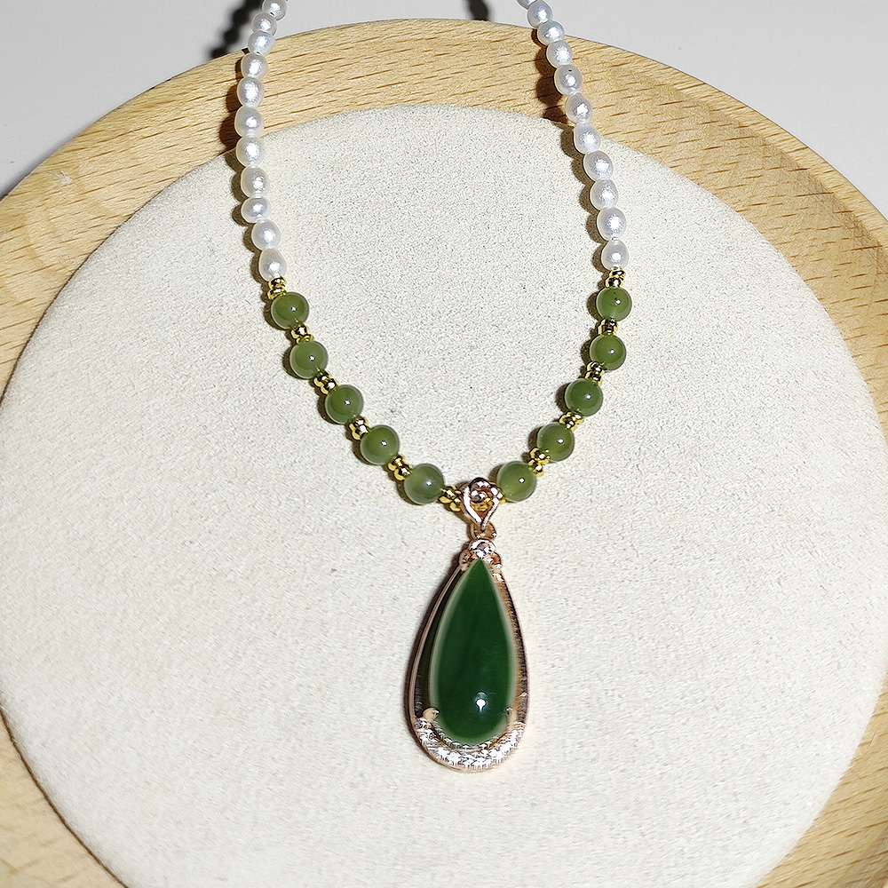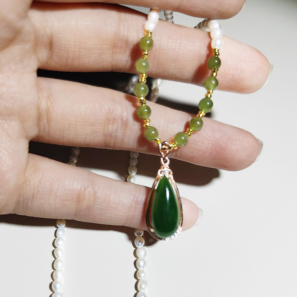 一方溫潤碧玉墜於頸間,縈繞著珍珠串起的溫柔光暈,演繹優雅與從容。