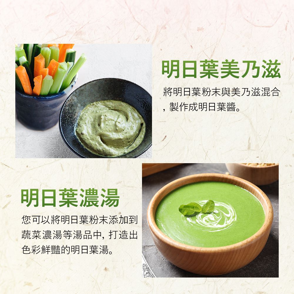 無論是早晨的果昔、午餐的湯品,還是晚餐的沙拉,明日葉粉都能為您的每一餐帶來健康的升級。