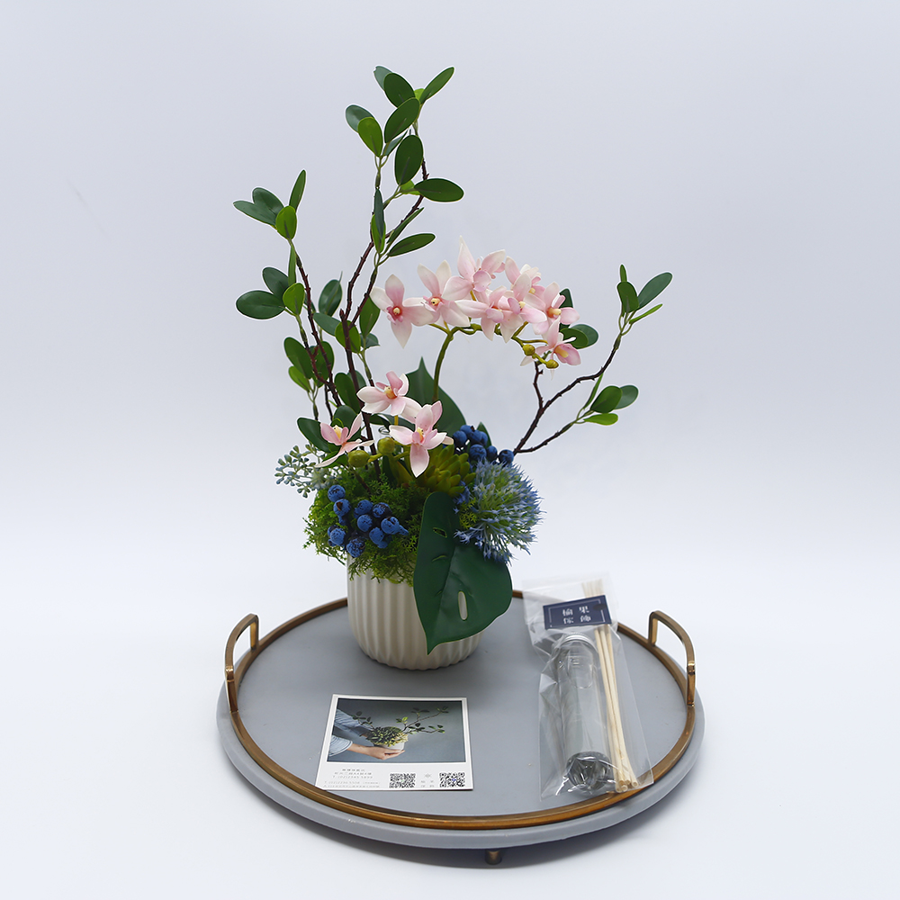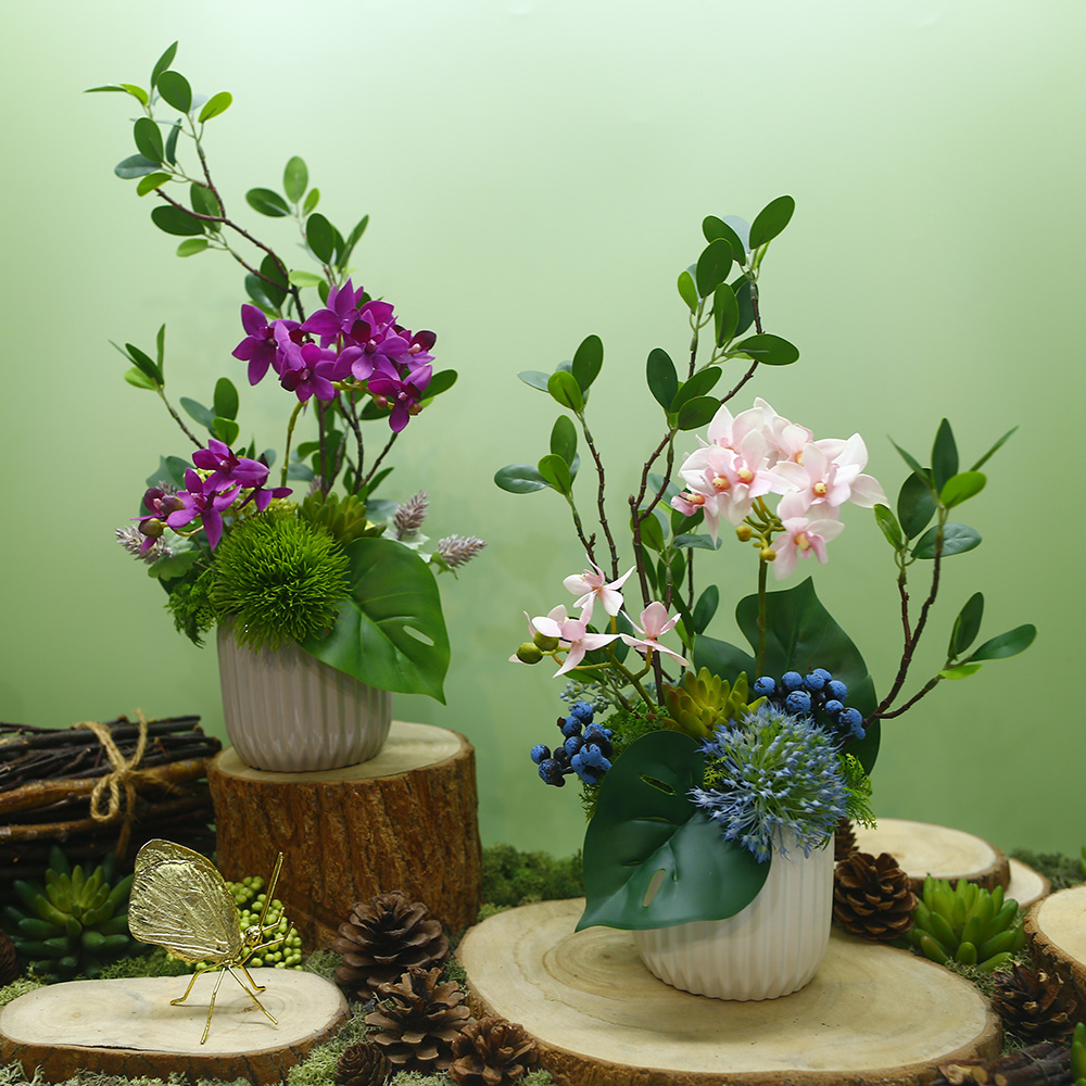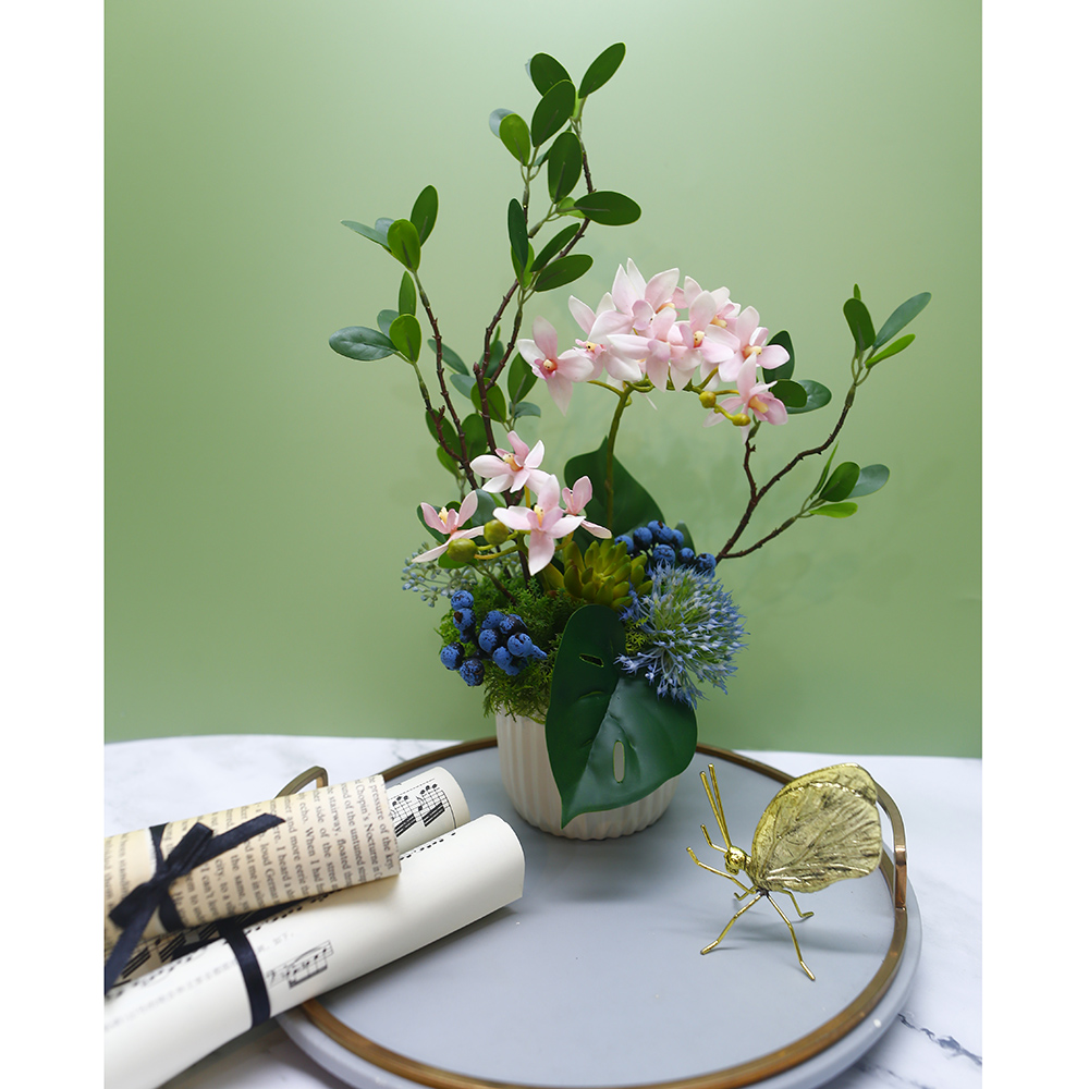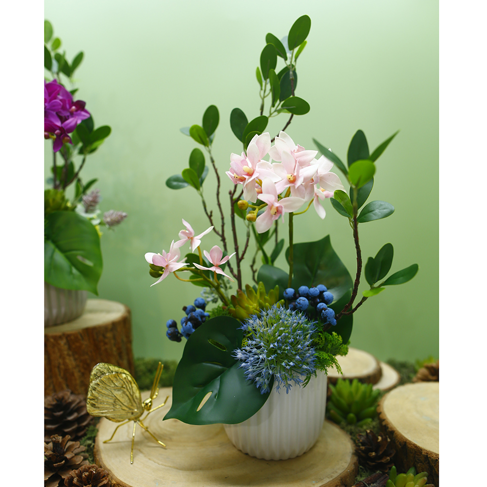 【HUGO DECO 榆果傢飾】雅緻粉蝴蝶蘭榕枝香氛花禮(擬真植物/人造盆栽/綠化/佈置/禮物)