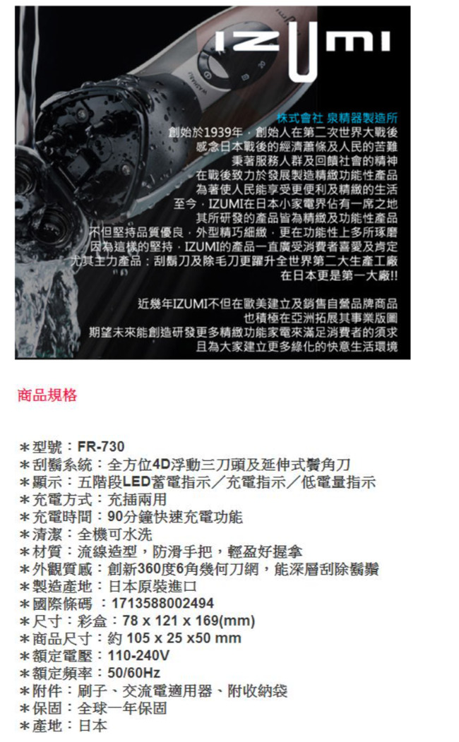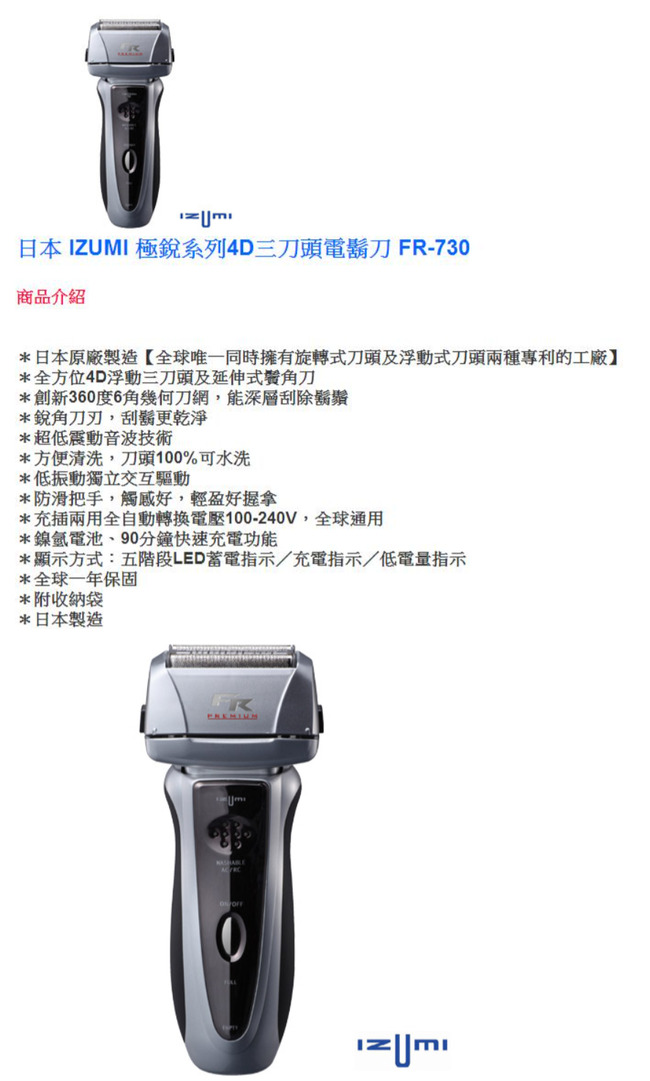 【IZUMI】極銳系列4D三刀頭電鬍刀 FR-730 三多福利品