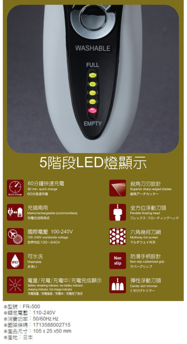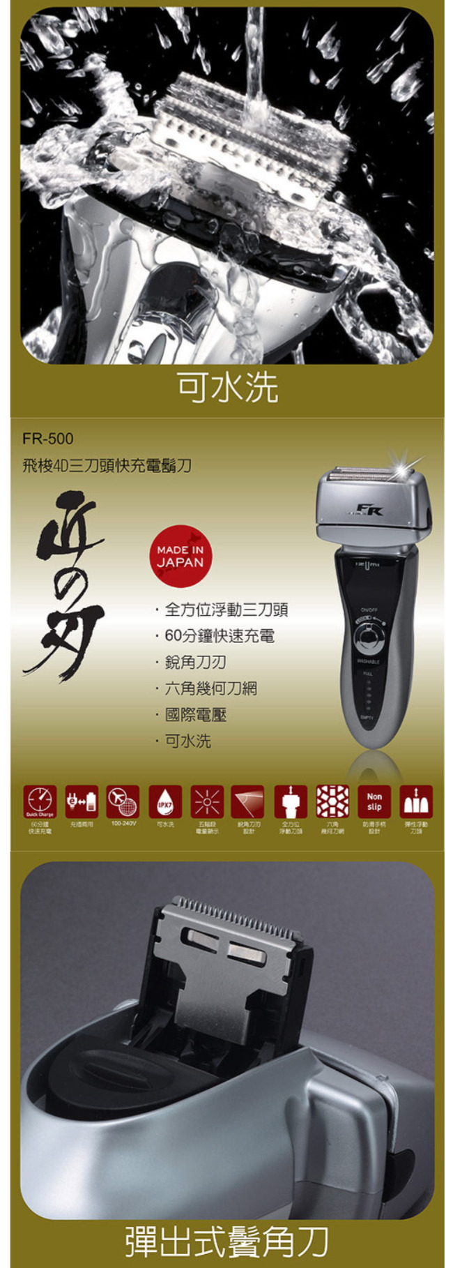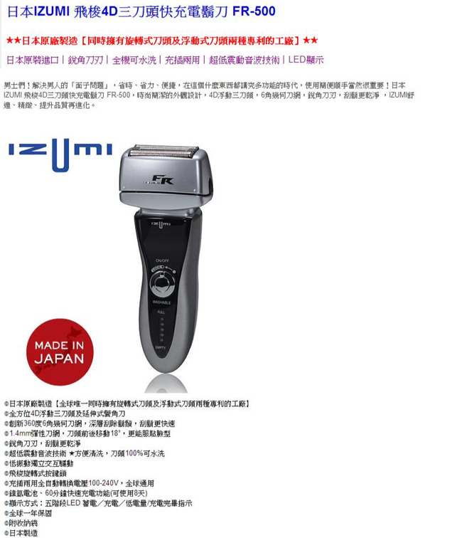 【IZUMI】福利品出清 日本 飛梭4D三刀頭快充電鬍刀 FR-500