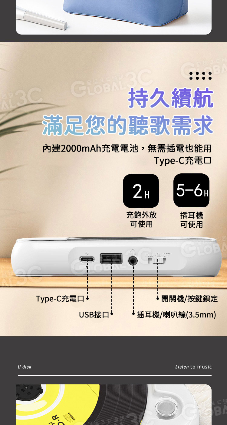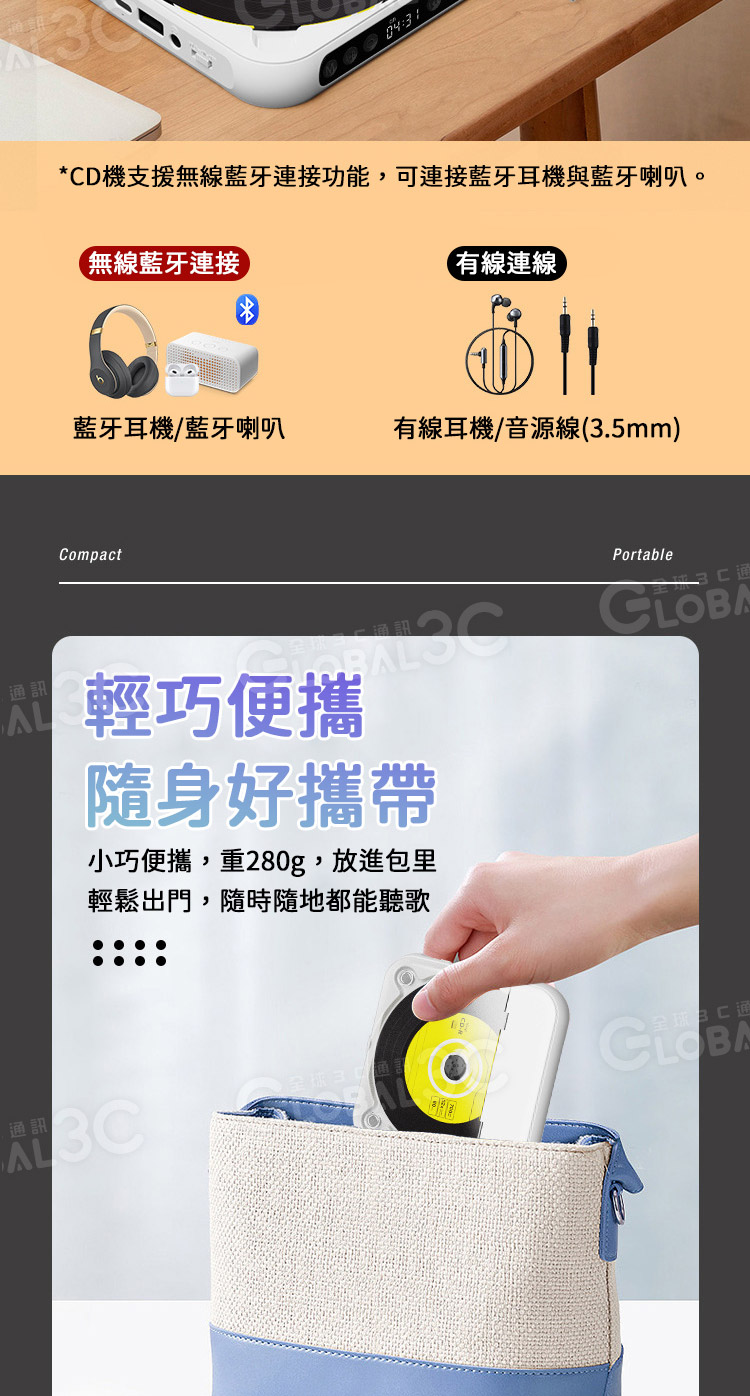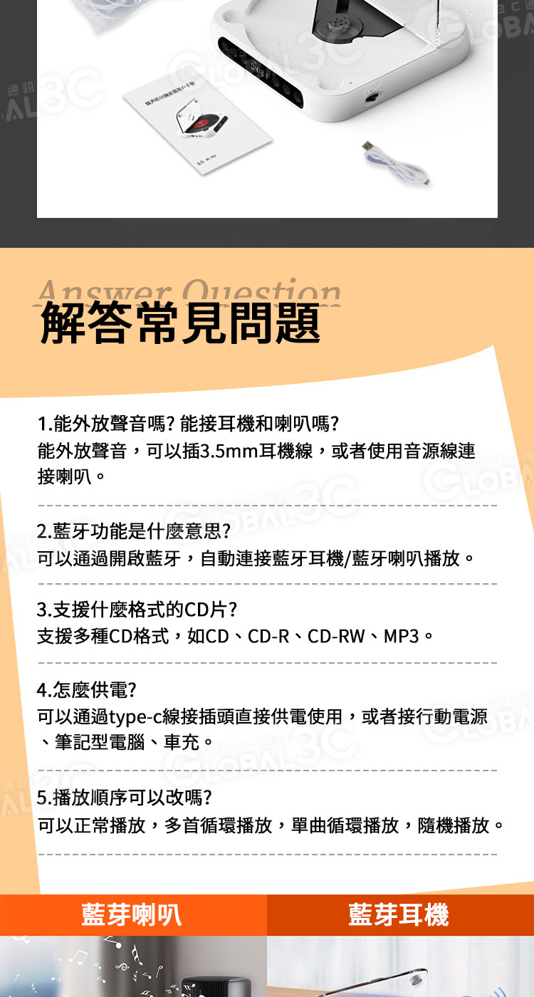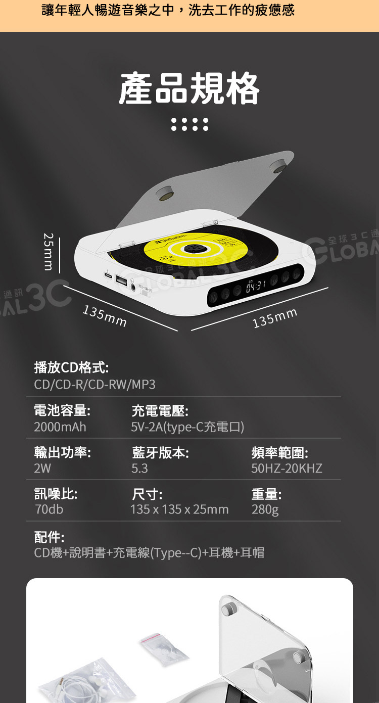 配件: CD機+說明書+充電線(Type--C)+耳機+耳帽