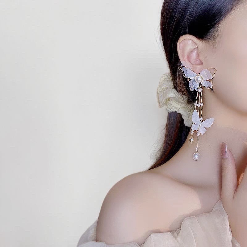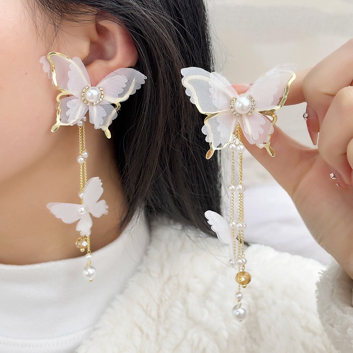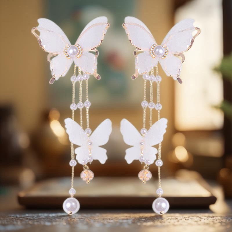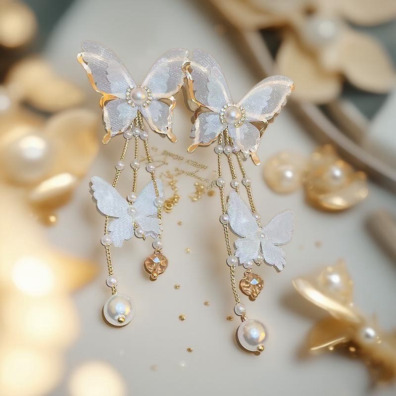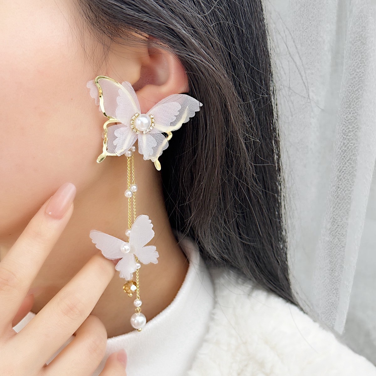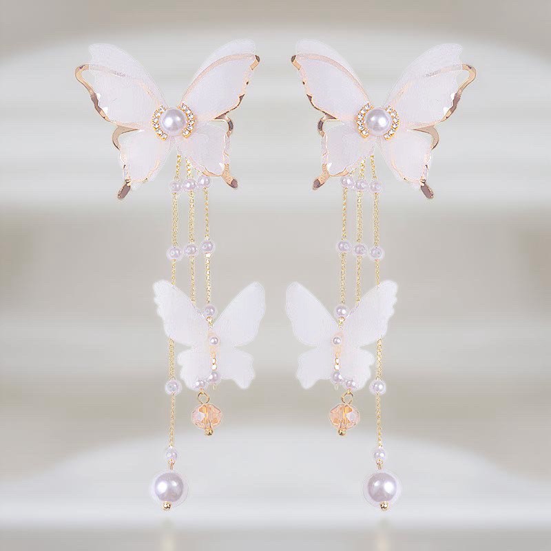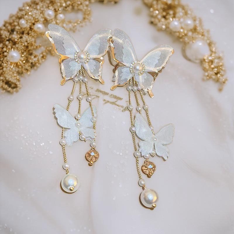 🌟商品名稱:BG416新娘超仙氣復古風耳環仙女白蝶白色蝴蝶耳環流蘇耳環超仙網紗蝴蝶耳環ins超仙個性耳飾蝴蝶鑲鑽珍珠耳環