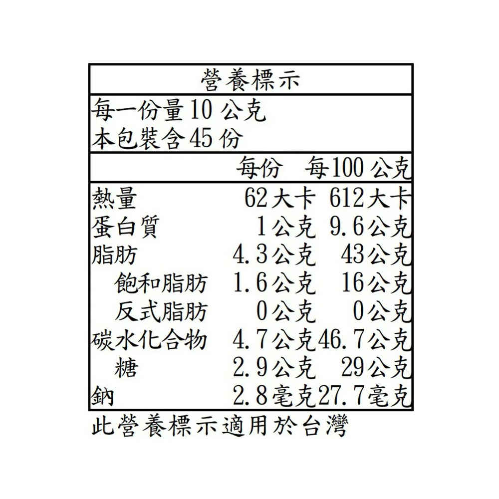 | 過敏原資訊 | 本產品含堅果類,麩質穀物,乳製品,大豆。本產品工廠同時生產含芒果,芝麻,蛋類製品,食物過敏者請留意 |