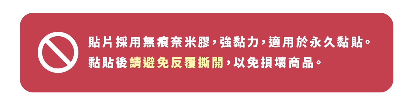 本產品貼片採用無痕奈米膠,隨使用時間黏性增強。首次黏貼後,請避免反覆撕開,以免損壞商品。