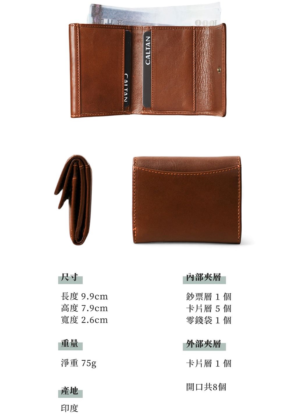 CALTAN全系列商品皆採用純牛皮製作,並做復古紋路特殊處理,故皆有皮革自然生成之皺褶、皮斑、紋理、色澤不一等現象,此為天然皮革之正常特性及魅力,非屬瑕疵範圍,敬請見諒。