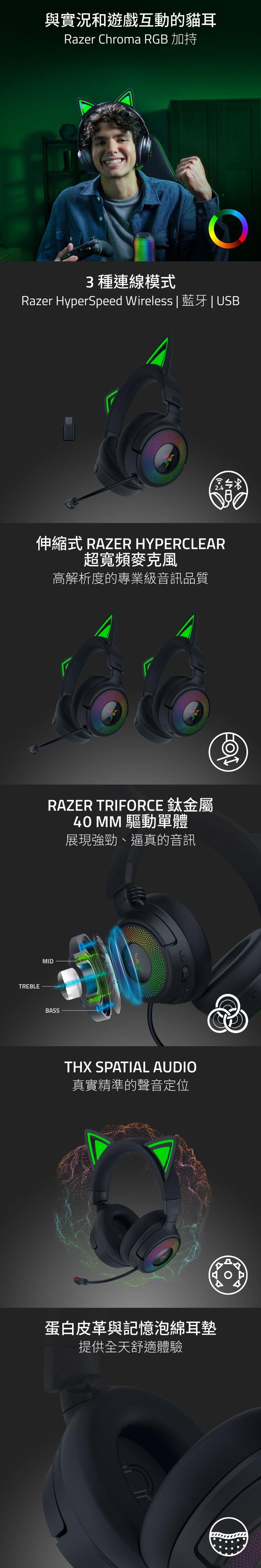 ●標誌性的貓咪耳朵設計●1,680 萬種顏色和無數燈光效果,可動態反應即時活動●具備 3 種連線模式選項●伸縮式 Razer HyperClear 超寬頻麥克風●電池續航力長達 70 個小時