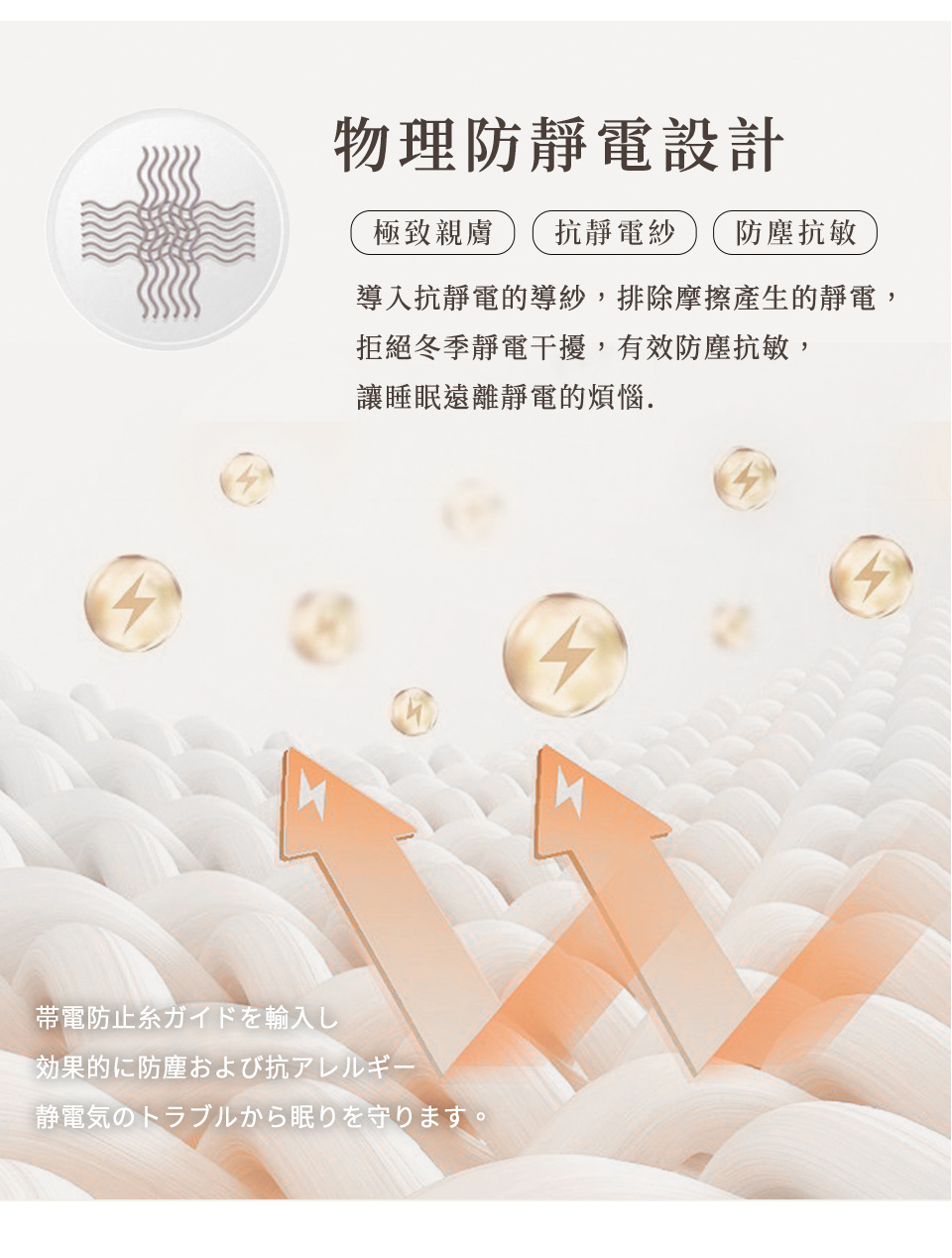 導入抗靜電的導紗,排除摩擦產生的靜電,防止冬季靜電干擾,有效防塵抗敏,讓睡眠遠離靜電的煩惱。