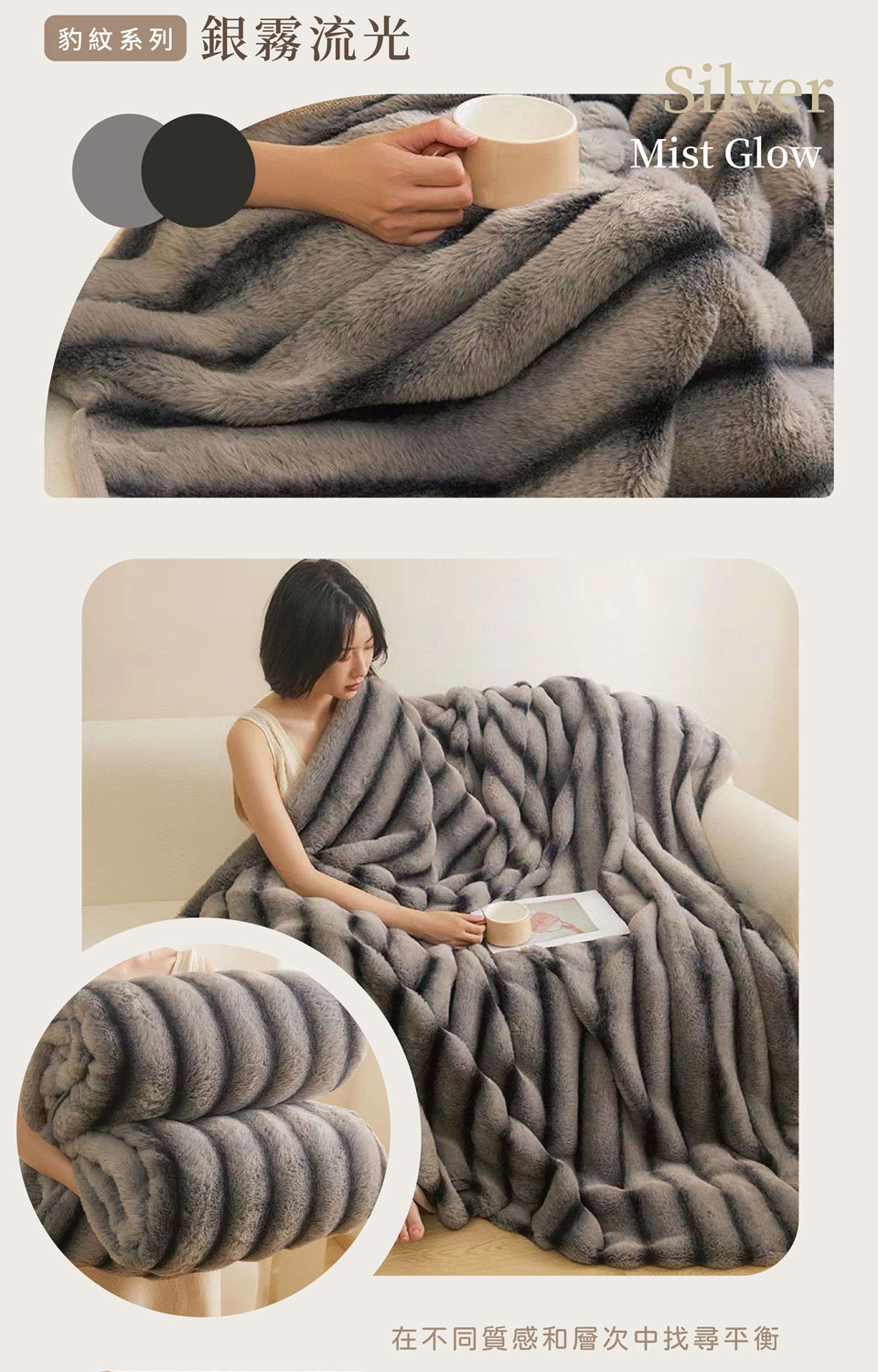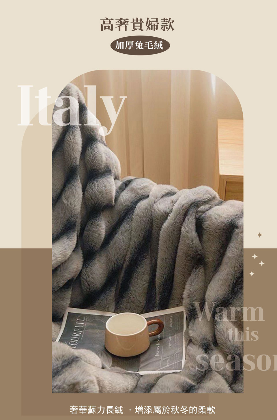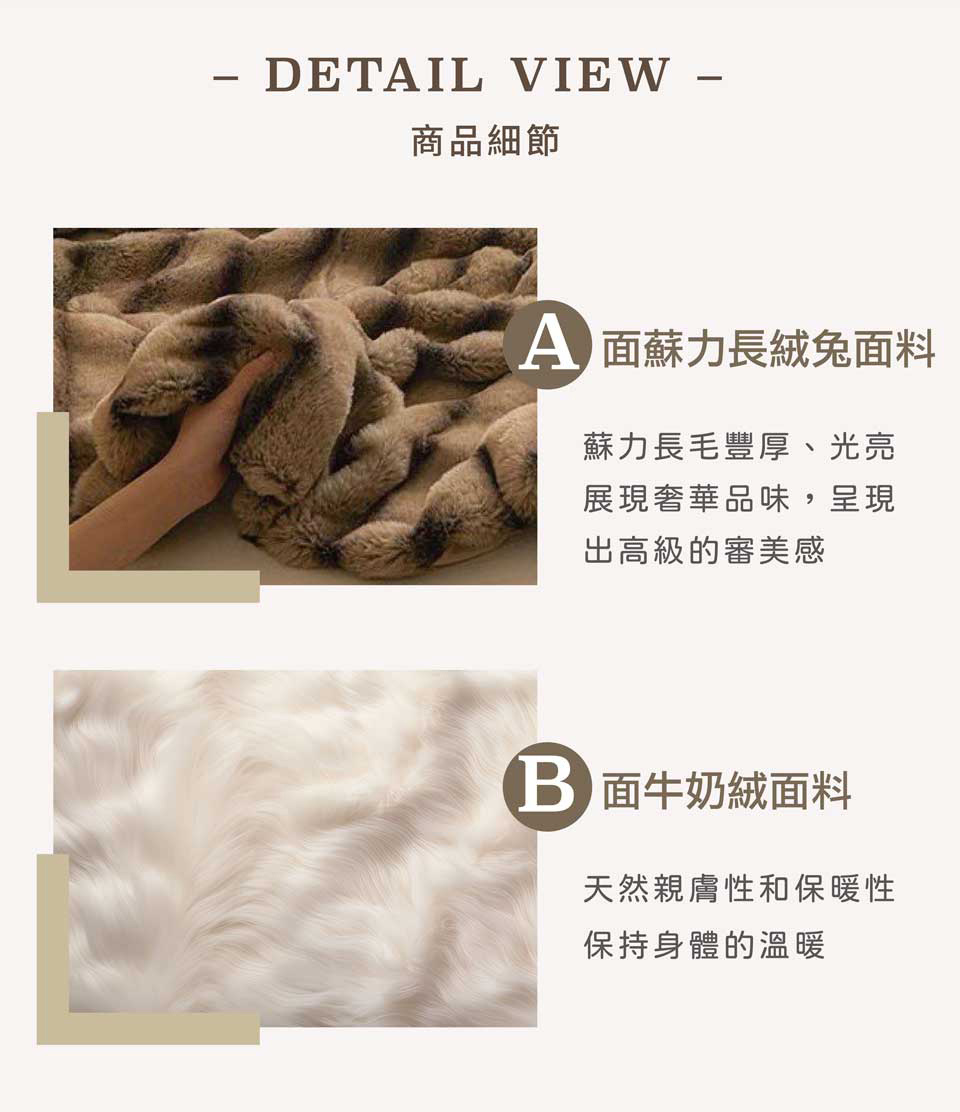 A版兔蘇力長絨兔毛毯 超柔軟親膚觸感,B版牛奶絨材質,細膩順滑。手感細膩、親膚滑順、瞬間鎖溫。