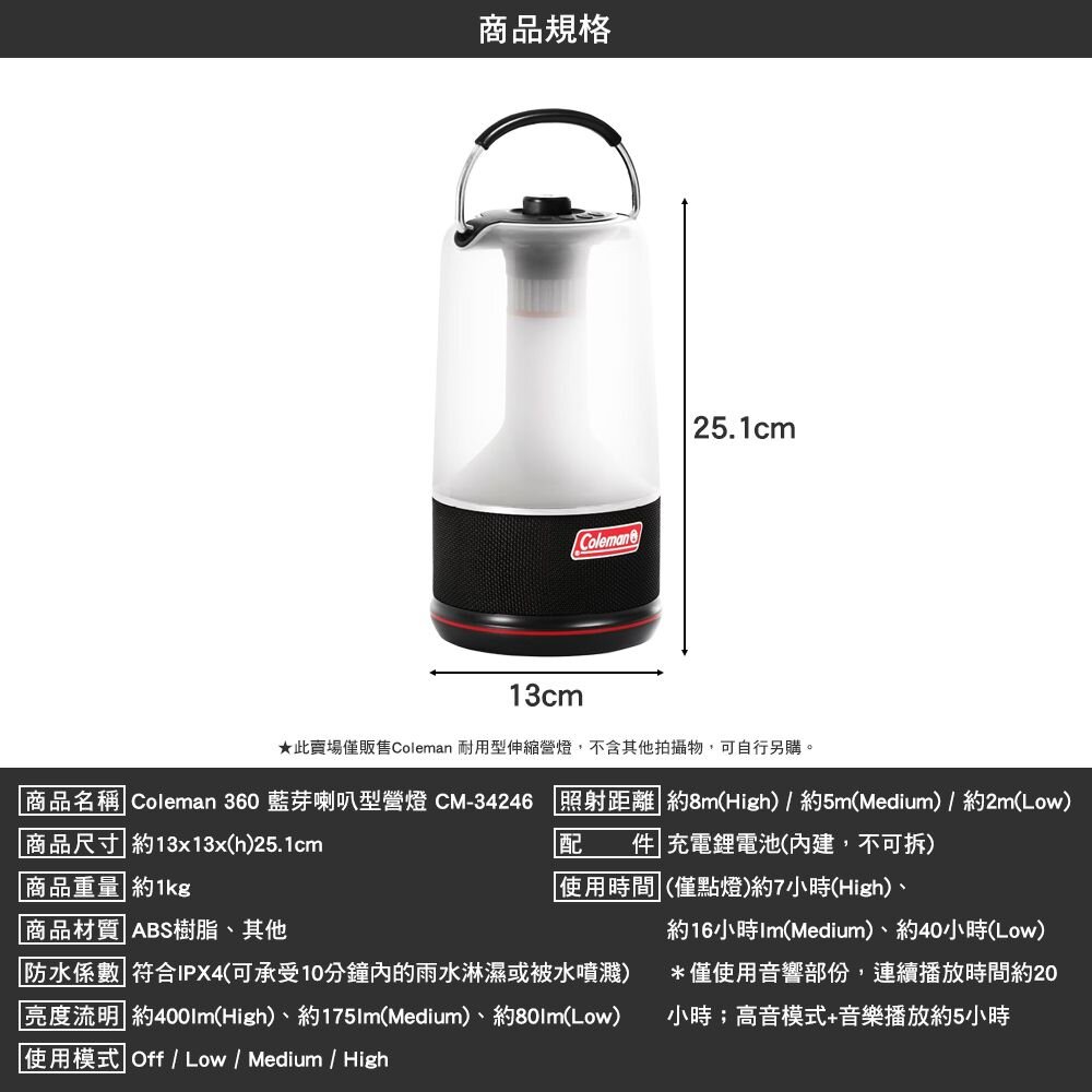 ★此賣場僅販售Coleman 360°藍芽喇叭型營燈 CM-34246,不含其他拍攝物,可自行另購。