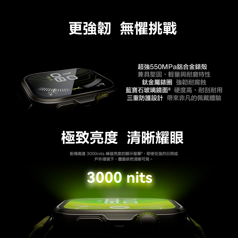 材質:藍寶石玻璃+前殼鋁合金表體+鈦合金錶圈+高分子纖維複合材料後殼