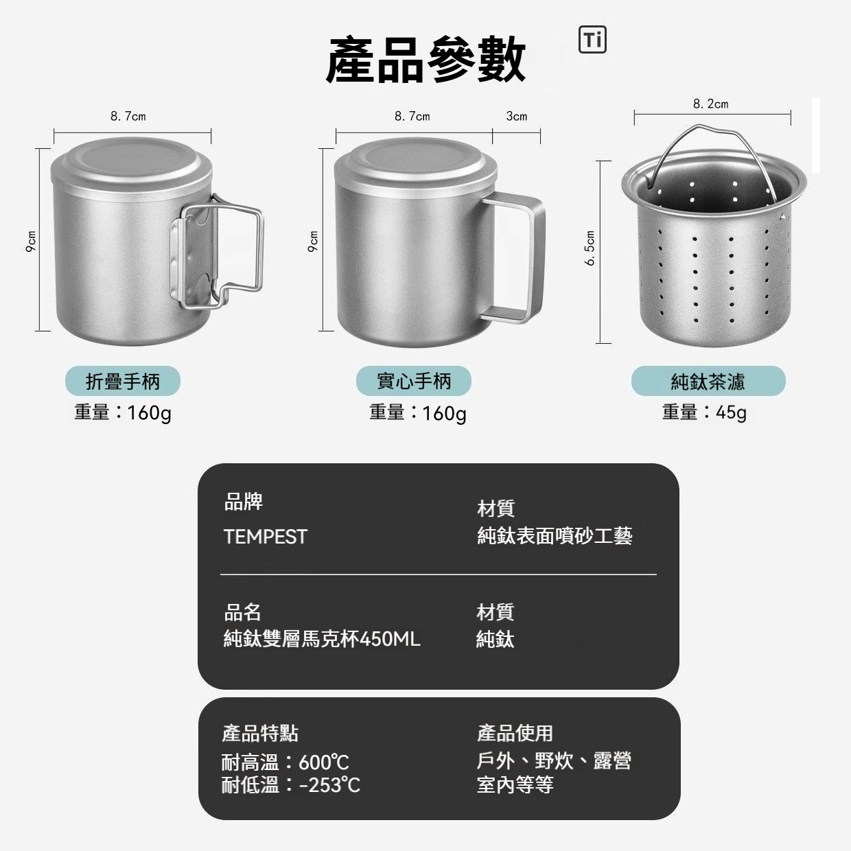 輕盈耐用 🏋️:純鈦材質輕巧耐用,杯身堅固不變形,無論是日常使用還是外出攜帶,都能輕鬆應對。