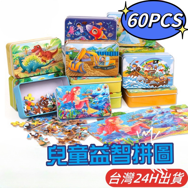 隔日到貨🌈60片兒童益智拼圖 木製鐵盒拼圖 卡通拼圖益智玩具 幼稚園生日分享禮物 美人魚 動物恐龍 交通工具 童話故事