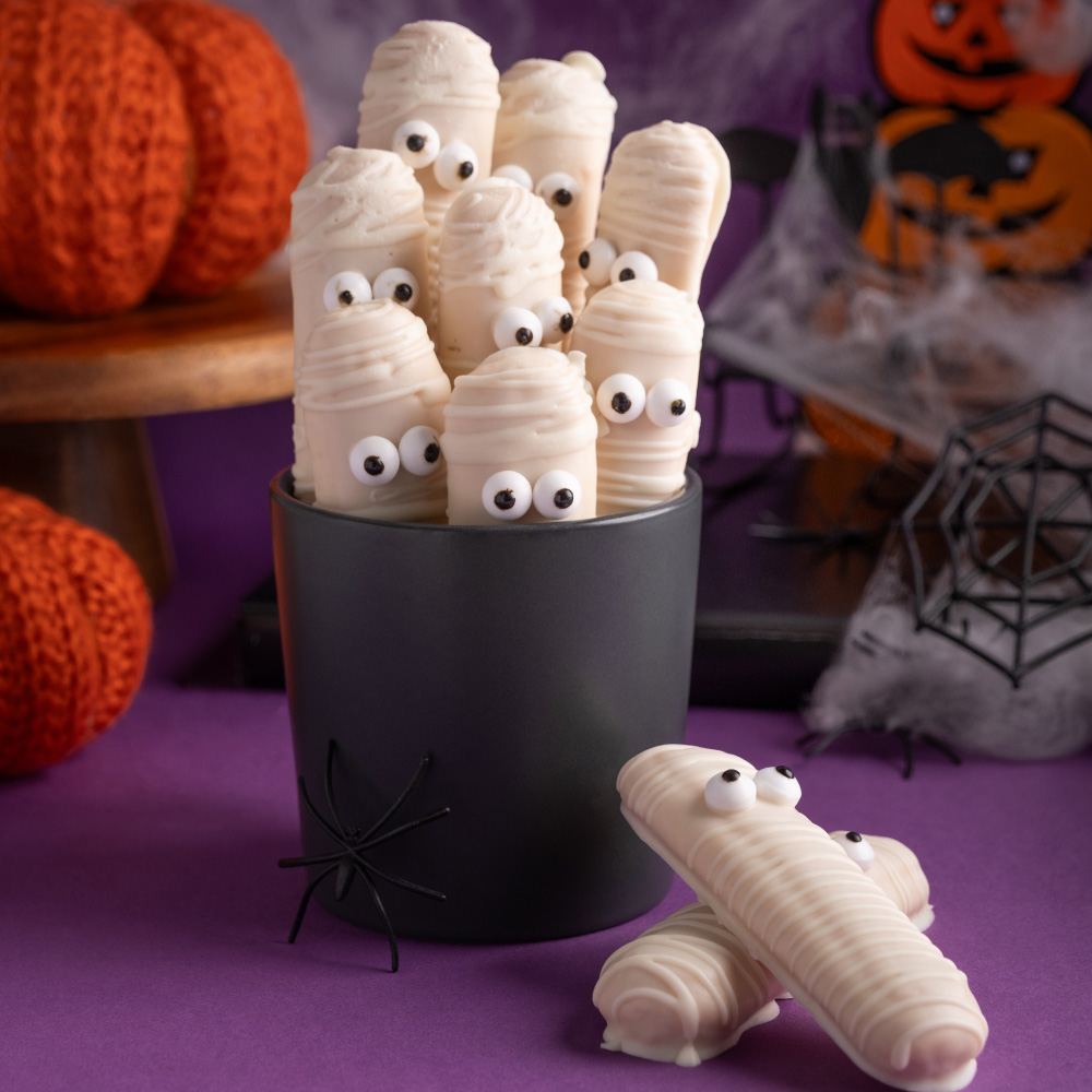 🧟♂️ 小心!木乃伊爬上餐桌啦!手指餅乾裹上絲絲白巧克力,化身一隻隻小木乃伊。酥脆的口感、甜蜜的包裹,不只嚇人也讓人忍不住想咬一口。萬聖節派對必備的「木乃伊巧克力餅乾」,越可愛越好吃!
