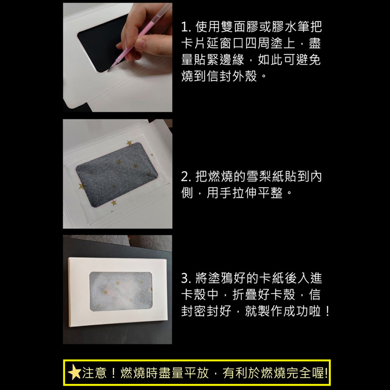 火柴、磷紙(劃火柴燃燒)、DIY空白卡紙、筆*1(隨機色)、雪梨紙、雙面膠