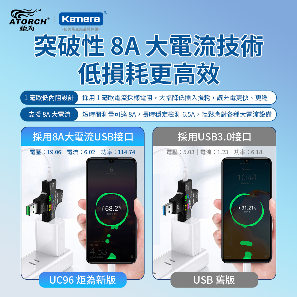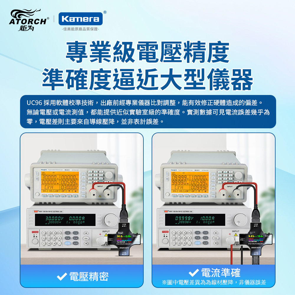 ❷ 容量數據提醒:UC96 顯示的「容量數據」是根據當前電壓計算的相對值,非電池原廠標示容量 (mAh)。若想估算手機電池或行動電源實際容量,需自行換算(例如:Wh ÷ V = mAh),此結果僅供參考,無法作為精準判定依據。