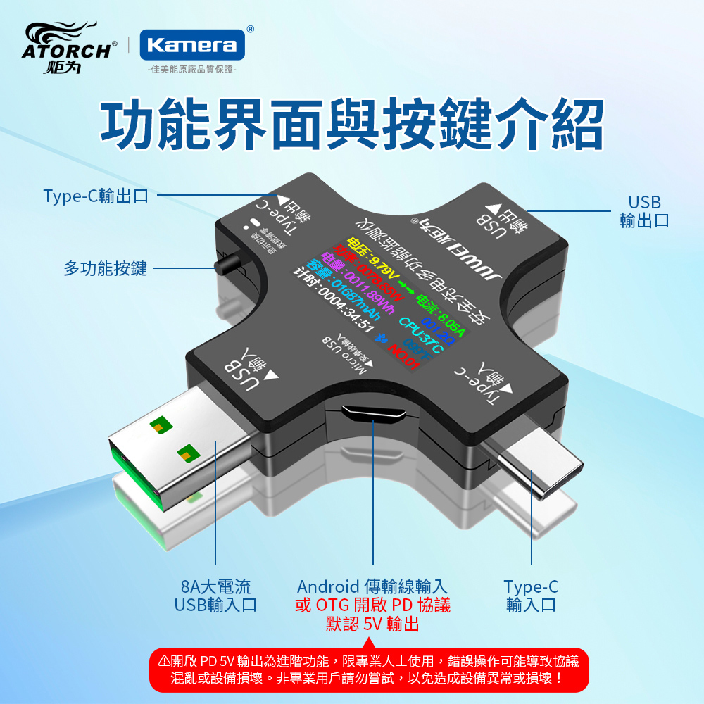● USB-A 接口:單獨插入 USB-A 電壓檢測器(不接設備)即可啟動,螢幕會顯示畫面。