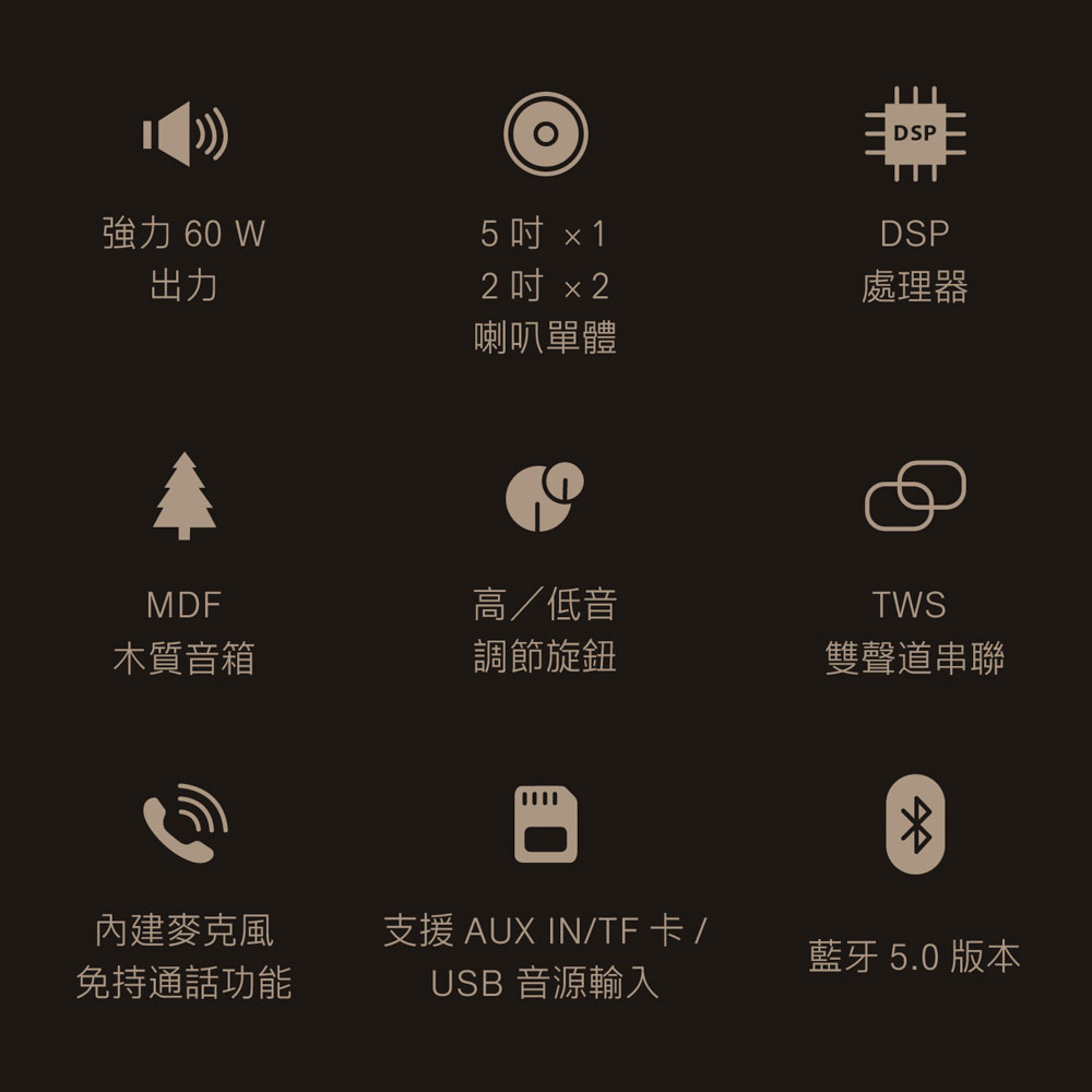 .5吋與2吋喇叭單體,⾼⾳絲滑細膩、中⾳⽣動立體、低⾳渾厚沉穩