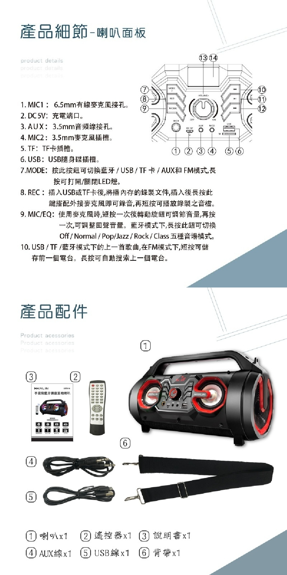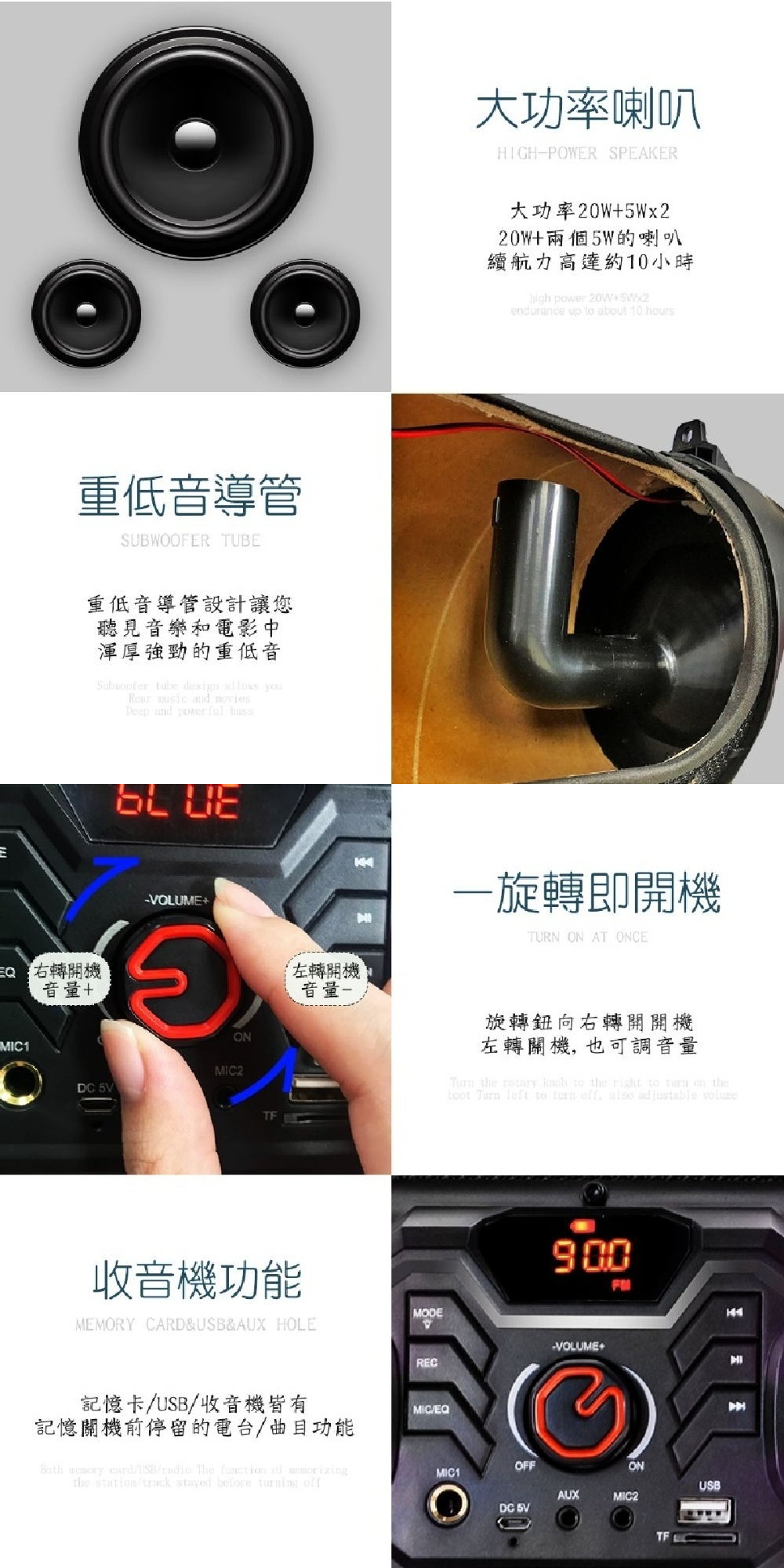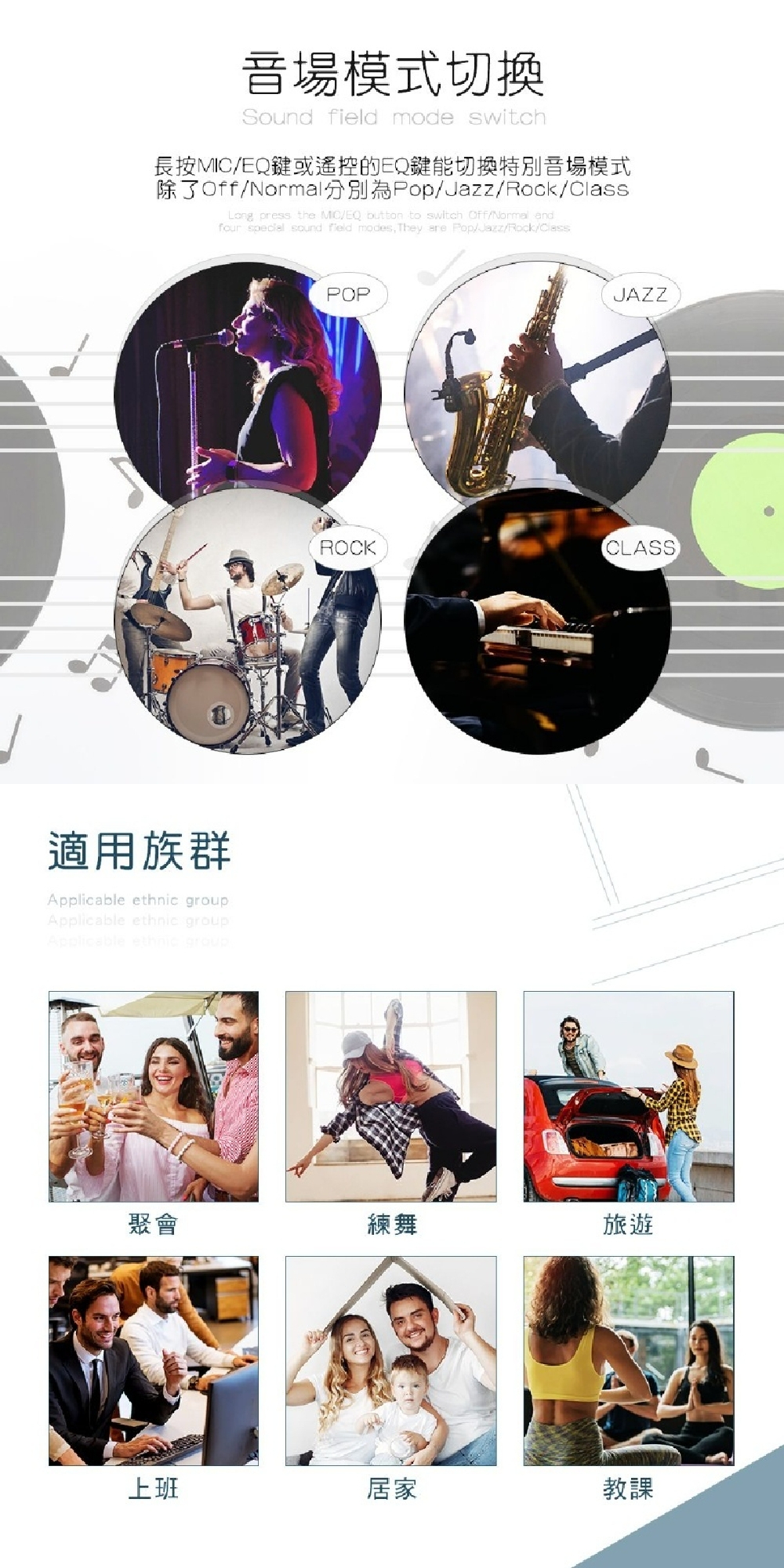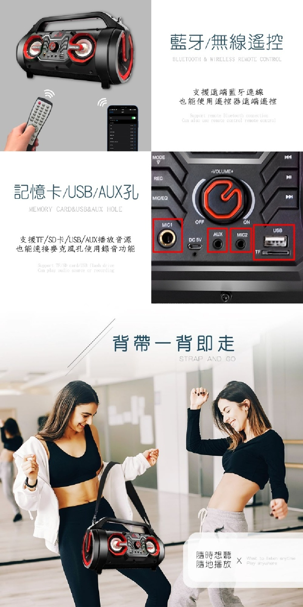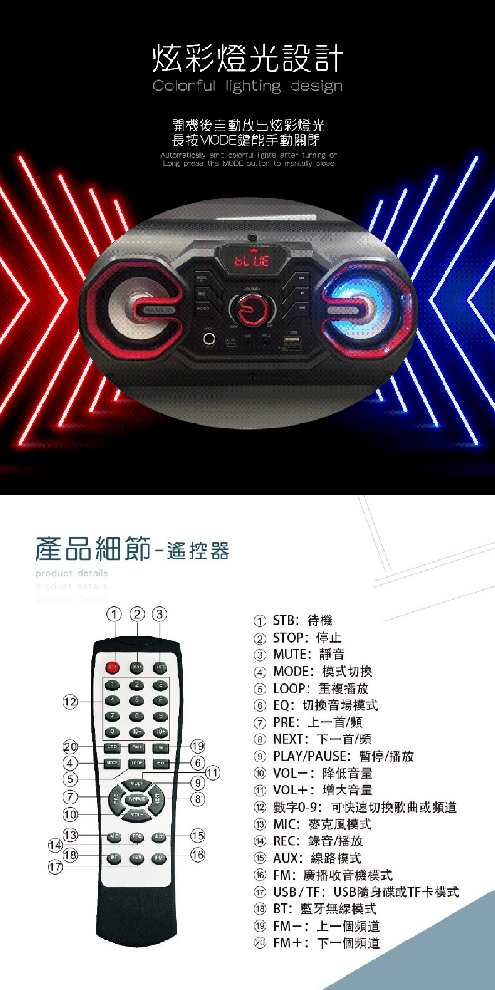 (藍牙、MP3音樂播放器、FM收音機、TF卡、AUX、USB音樂播放器、遙控器、EQ、卡拉OK、可調節彩色燈光)