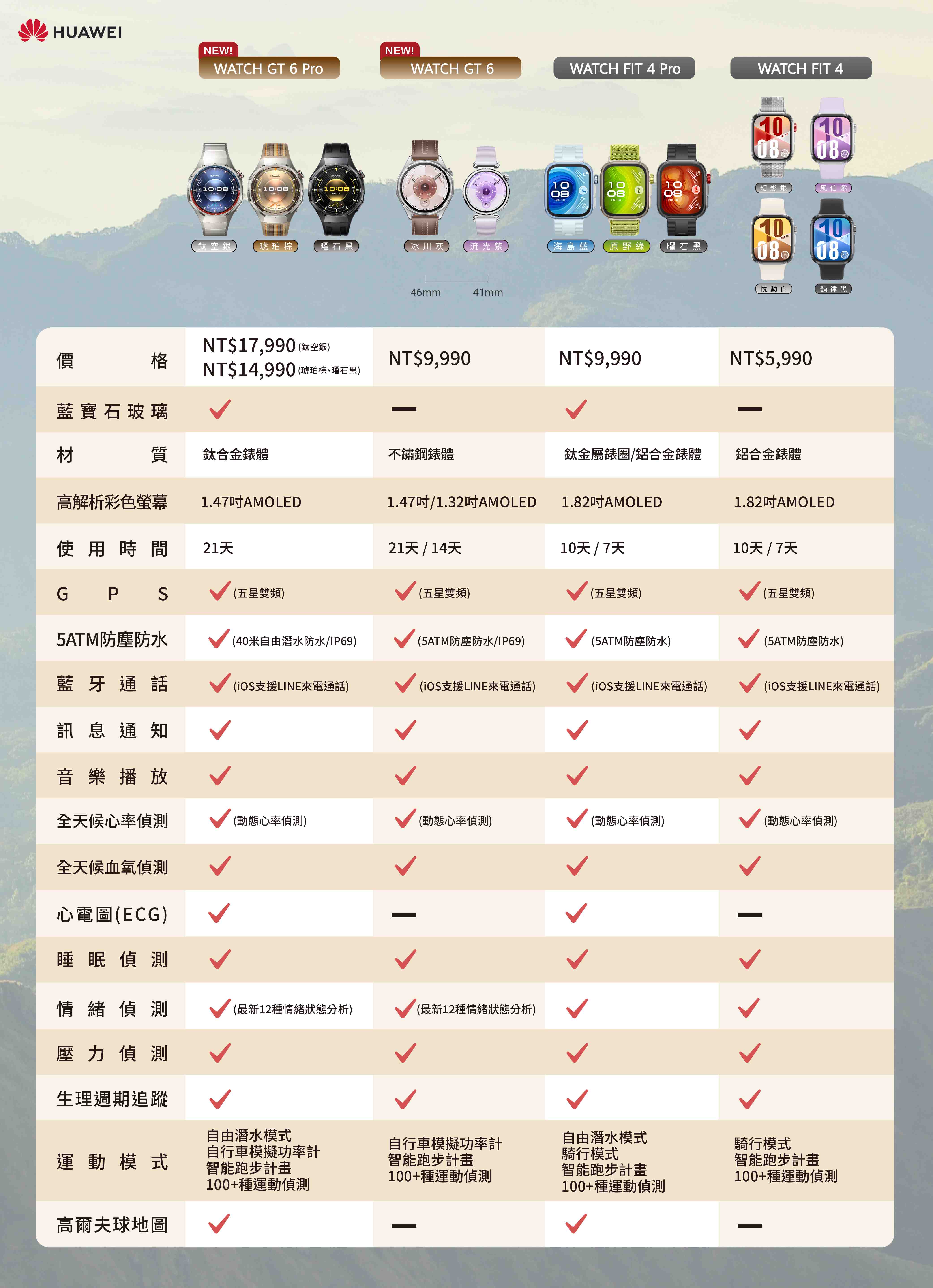 防水級別5 ATM*符合 ISO 22810:2010 標準規定的 5 ATM 防護等級,表示該設備能夠在實驗條件下承受等同於 50 米靜態水深的壓力長達 10 分鐘。此測試結果並不等同於保證 50 米水下動態場景中的防水能力。IP69*符合 IEC 60529:2013 標準規定的 IP69 等級防水性能。 IPX9 測試條件如下:水溫:80±5°C;水流量:15±1 公升/分鐘;水壓:10,000±500 kPa;噴水角度:0°、30°、60° 和 90°,每個角度 30 秒。這並不代表熱水淋浴時也能提供保護。本產品可在泳池游泳、海岸游泳等淺水活動中配戴。佩戴後請及時清潔並擦乾,清除產品表面及所有孔洞中的水漬,並使用設備的排水功能,以免對設備性能產生負面影響。以下情況請勿配戴本產品:(非適當情況下配戴,導致設備浸入液體而造成的損壞不在保固範圍內)(1)熱水淋浴、泡溫泉、桑拿(蒸氣室)等高溫高濕環境下的活動。(2)可能接觸沐浴乳、洗髮精、肥皂水等洗衣清潔用品的活動。如果設備接觸到此類產品,請立即用清水沖洗並浸泡 30 分鐘。(3)自由潛水、水肺潛水等潛水活動。(4)複合人造皮革、複合編織、鈦金屬、陶瓷錶帶並非為游泳等水上活動或防汗而設計,建議在上述情形下使用其他錶帶。抗水性能並非永久性,且性能可能會隨著日常磨損而下降。建議您定期將裝置帶到華為授權服務中心進行檢查和維修。