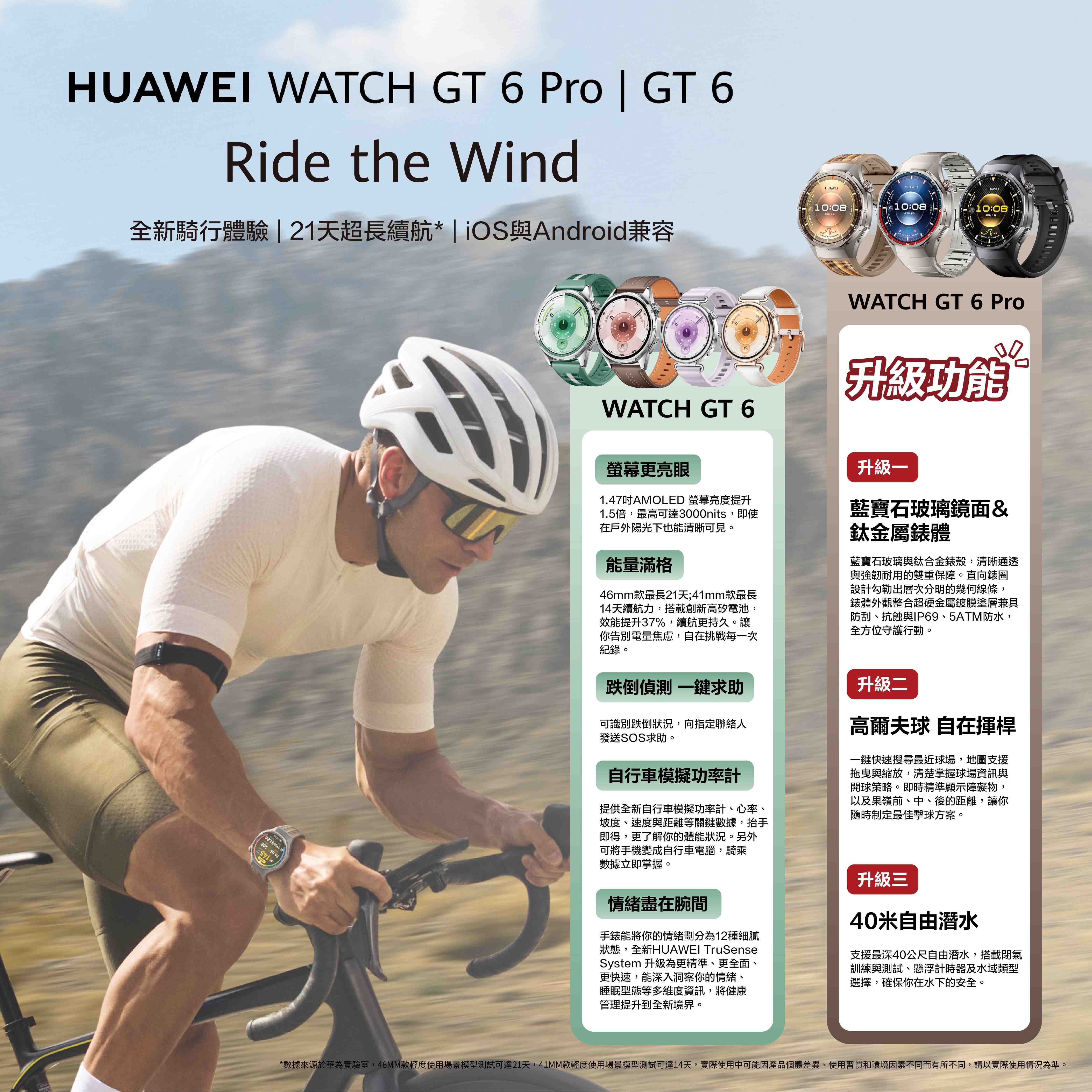1本產品不是醫療設備,監測數據及結果僅供參考,不應作為醫療診斷或治療的依據。2數據來自於華為實驗室。HUAWEI WATCH GT 6 (46 mm) 續航力最長可達 21 天,HUAWEI WATCH GT 6 (41mm) 續航力最長可達 14 天。實際使用情況會因產品差異、使用習慣和環境因素而有所不同。