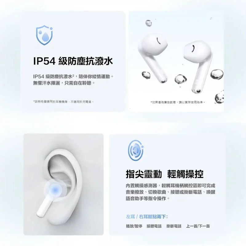 輕點兩下:可實現接聽電話/掛斷電話/上一首/下一首/播放/暫停/喚醒語音助手