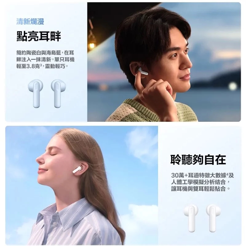 包裝盒內容物:耳機 × 2(左右耳各 1)充電盒 × 1USB-C充電線X1快速指南 & 安全資訊 × 1